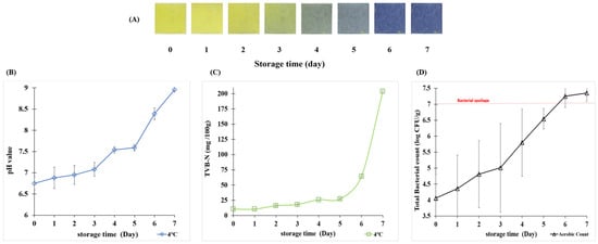 pH is defined in aqueous solutions as the concentration of protons (H+), and cannot be strictly applied to gases. However, the high humidity inside food packaging promotes the formation of a thin water layer on the FI surface. In this layer, volatile amines become protonated and trigger color changes in pH-sensitive indicators. Previous studies have confirmed that volatile amines can be detected in the gas phase using smart-material-based indicators that exhibit clear color transitions upon amine exposure [26]. The pH of the skate was 6.75 in its initial fresh state. Over the 7-day storage period it gradually increased to 8.96. This supports the conclusion that microbial activity in skate leads to the breakdown of TMAO into TMA and NH3, resulting in a pH increase [10,27]. The pH change pattern is shown in Figure 2B [28]. This upward trend matched the color transition observed in the pH-sensitive FI developed. During days 1–2 the FI maintained yellow, reflecting a relatively low pH (≤6.7). The pH exceeded 7.0 between days 3 and 4 and the indicator shifted to green or greenish-blue. From day 5 onward the pH rose sharply above 8.0 and the FI color changed to blue, visually indicating the onset of freshness loss. Furthermore, the FI labels themselves showed no significant change under ambient lighting and remained stable for more than 3 months without detectable variation.