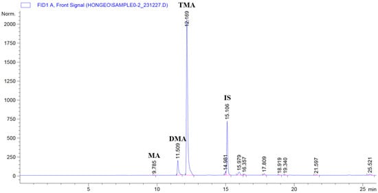 GC-FID analysis was performed to identify and quantify volatile amines related to freshness loss in skate sashimi. The target compounds were MMA, DMA, and TMA. Figure 3. presents a representative chromatogram of a skate sashimi sample containing MMA, DMA, TMA, and IS. Identification was determined from the retention times of pure standards: MMA (9.75–9.80 min), DMA (11.05–11.55 min), TMA (12.20–12.42 min), and IS (15.10–15.52 min).
