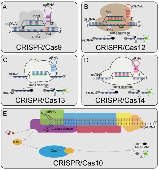 Overview of CRISPR-Cas enzyme activities and their catalytic mechanisms (A) Cas9 can cleave the target and non-target strands of DNA; a short trinucleotide PAM is also essential for the initial DNA binding; (B) Cas12a can cleave dsDNA under the guidance of gRNA. The Cas12a enzyme recognizes a T-rich PAM and then cleaves the target sequence to generate dsDNA breaks distal to the PAM with staggered 5′ and 3′ ends; Cas12a also has trans-cleavage activity. Once Cas12a binds its target DNA, guided by the crRNA, it unleashes a powerful, non-specific single-stranded DNA (ssDNA) cleavage activity; (C) Cas13 activates its single-stranded RNA (ssRNA) cleavage activity by binding to a crRNA, and it has an additional cleavage activity that is triggered by the target RNA; (D) Cas14 protein is a RNA-guided nuclease and can recognize the target ssDNA without restriction sequences and cleave it, and also can non-specifically cleave the surrounding ssDNA nucleases molecule; (E) Cas10 is a multi-component and multi-pronged immune effector that can be activated by viral RNA, activating Cas10 cyclase activity to produce thousands of cyclic nucleotides (cOA). cOA activates Csx1, cutting off the fluorophore connected to the quencher (Adapted from [12], License: CCBY).