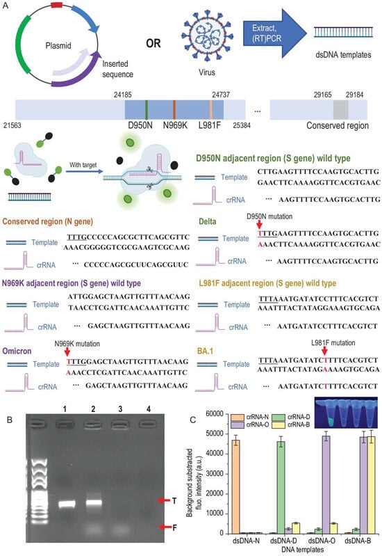 DNA templates, design of crRNAs and the verification of specificity. (A) dsDNA templates were acquired by amplifying certain inserted sequences in the plasmids or extracting RNA from the virus and performing RT-PCR. SHERLOCK assay was performed by mixing Cas12a protein, crRNA, DNA template and FAM-BHQ probes and incubating at 37 °C for 30 min. Only if the crRNA and DNA were paired would the trans-cleavage happen and freed FAM generate fluorescence. Several mutation sites on S gene sequence and a highly conserved region on N gene sequence were selected as the targets. For D950N and N969K mutation sites, representing Delta and Omicron variants, respectively, TTTV PAM sequences are formed and therefore they have a much higher affinity with the Cas12a protein compared to wild-type sequences. For L981F, which represents the Omicron-BA.1 variant, crRNA was designed according to the mutation sequence. (B) Verification of successful trans-cleavage and cis-cleavage was performed using agarose gel electrophoresis. Lane 1, 100 nM DNA template (N gene) only; Lane 2, the 100 nM DNA template performed a SHERLOCK assay, cis-cleavage (T band) and freed FAM coursed by trans-cleavage (F band) were observed; Lane 3, the 1 nM DNA template performed a SHERLOCK assay, although the band of DNA was not observed because of the low loading amount—trans-cleavage (F band) was also observed; Lane 4, 0.01 nM DNA template performed SHERLOCK assay—neither of the bands was observed because the loading amount was too low and no FAM was freed by trans-cleavage. (C) Specificity of the crRNA-dsDNA pairs was performed by cross-reactions between each crRNA and dsDNA template (10 nM). Only right paired reactions were observed with strong fluorescence signals: dsDNA-N and crRNA-N; dsDNA-D and crRNA-D; dsDNA-O and crRNA-O; dsDNA-B and crRNA-O/crRNA-B (because BA.1 is one subtype of Omicron). The difference between positive reactions (strong fluorescence) and negative reactions (transparent) is also presented (Adapted from [77], License: CCBY).