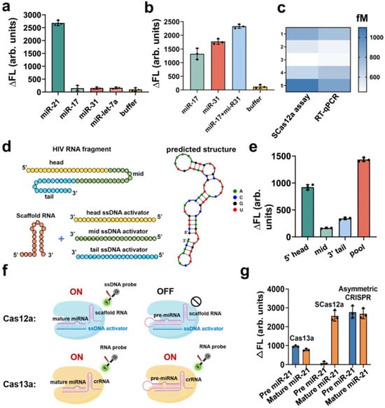 Quantitative detection of RNA by SCas12a assay. (a) Selective detection of the target miR-21 (10 pM) in the different types of miRNAs (1 nM), including miR-17, miR-31 and miR-let-7a. (b) Multiplexed detection of miR-17 and miR-31 in the same reaction. (c) Heatmap of the estimated concentrations of target miR-21 using the SCas12a assay or conventional RT-qPCR assay. (d) Schematic of an HIV RNA target and three ssDNA activators targeting it at different positions. The predicted secondary structure of this HIV RNA was determined using NUPACK 4.0 software. (e) Comparison among the head, mid, tail and pooled HIV targeting ssDNA activators. (f) Schematic of the detection of mature miRNA and pre-miRNA using SCas12a or Cas13a based fluorescence assay. (g) Comparison of fluorescence intensity changes between pre miR-21 and mature miR-21 measured using Cas13a, SCas12a or Asymmetric CRISPR assay. The concentrations of pre-miR-21 and mature miR-21 were both 10 nM in each reaction. For (a,b,e,g), all the experiments were conducted in triplicate and error bars represent mean value +/− SD (n = 3) (Adapted from [87], License: CCBY).