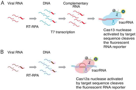 Two alternative CRISPR methods for detecting viral RNA. Method (A) (SHERLOCK assay [5]: RT-RPA (recombinase polymerase amplification) converts viral RNA to dsDNA. T7 transcription generates complementary RNA from the dsDNA template. The Cas13–tracrRNA complex binds to the target sequence, which activates the general nuclease enzyme activity of Cas13 to cleave the target sequence and the fluorescent RNA reporter. Method (B) (DETECTR assay [17]: RT-RPA (recombinase polymerase amplification) converts viral RNA to dsDNA. The Cas12a–tracrRNA complex binds to the target sequence, which activates the general nuclease enzyme activity of Cas12a to cleave the target sequence and the fluorescent RNA reporter (Adapted from [97], License: CCBY).