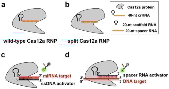 Schematic illustration of the split Cas12a-based assay for the direct detection of miRNA and DNA. (a) Schematic illustration of the wild-type Cas12a RNP. (b) Schematic illustration of the split Cas12a RNP. (c) The principle of the amplification-free fluorescence assay developed for the direct detection of miRNA target in this study. (d) The principle of the fluorescence assay for the direct of DNA target in this study (Adapted from [87], License: CCBY).