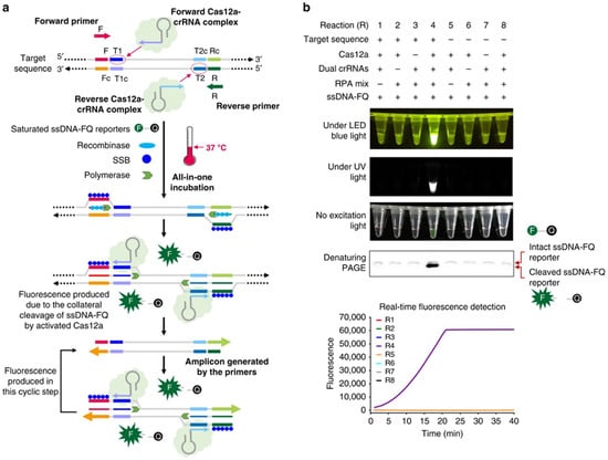 Design and working principle of the AIOD-CRISPR assay. (a) Schematic of the AIOD-CRISPR assay system. SSB is single-stranded DNA binding protein. The four sites in the target sequence are labeled as F, T1, T2, and R, respectively. The letter c represents the corresponding complementary site. For example, F and Fc sites are complementary. The short horizontal lines with the same colors denote the same sites and their arrows represent the direction of 5′–3′. (b) Evaluation of eight AIOD-CRISPR reactions (R) with various components through endpoint imaging after 40 min incubation, denaturing polyacrylamide gel electrophoresis (PAGE) analysis of the single-stranded fluorescent reporter (ssDNA-FQ), and real-time fluorescence detection. The ssDNA-FQ was labeled by 5′ 6-FAM (Fluorescein) fluorophore and 3′ Iowa Black FQ quencher. Recombinase polymerase amplification (RPA) mix from TwistAmp Liquid Basic kit was composed of 1× Reaction Buffer, 1× Basic E-mix, 1× Core Reaction Buffer, 14 mM MgOAc, 320 nM each of primers, and 1.2 mM dNTPs. Dual crRNAs contained 0.64 μM each of crRNAs specific to the SARS-CoV-2 N gene sequence. A plasmid containing the SARS-CoV-2 N gene sequence (3 × 103 copies), 8 μM of ssDNA-FQ reporters, and 1.28 μM EnGen Lba Cas12a (Cpf1) were used. Each experiment was repeated three times with similar results (Adapted from [178], License: CCBY).