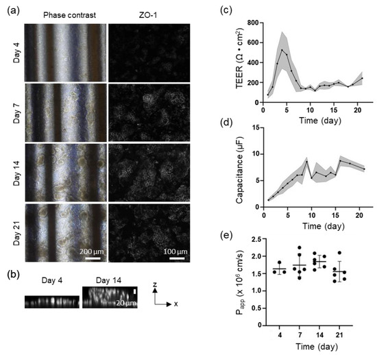 Effects of perfusion culture of Caco-2 cells on the Fluid3D-X TEER on TEER, capacitance, and Lucifer yellow permeability (Papp). Caco-2 cells were cultured with medium perfusion (the perfusion rate is described in Section 2.4). (a) Representative phase contrast and immunohistostaining of Caco-2 cells at 4, 7, 14, and 21 days after seeding; magnification ×100 (phase contrast) and ×200 (ZO-1 immunohistostaining). (b) Representative layer thicknesses of Caco-2 cells. Blue: DAPI, red: ZO-1; magnification ×200. (c) Time course of the actual TEER value of Caco-2 cells on Fluid3D-X TEER, n = 23 (eight independent experiments, triplicate or quadruplicate chips/experiment excluding chips with electrode defects or problems with cell seeding). Mean and error with standard deviation, gray area means the area within error bands. (d) Time course of the actual capacitance value of Caco-2 cells on Fluid3D-X TEER, n = 17 (six independent experiments, triplicate or quadruplicate chips/experiment, excluding chips with electrode defects or problems with cell seeding). Mean and error with standard deviation, gray area means the area within error bands. (e) LY permeation test results. The Papp results are obtained at each time point on day 4 (n = 1, one experiment, triplicate chips per experiment), as well as on days 7, 14, and 21 (n = 2, two independent experiments, triplicate chips per experiment). Each dot represents the actual value of Papp.