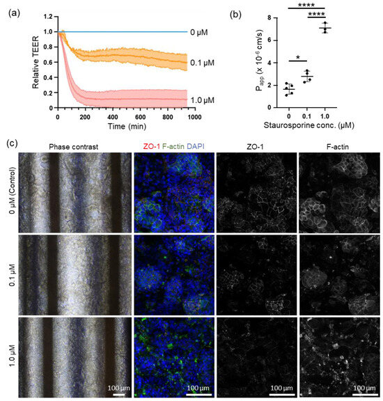 Effect of staurosporine (STA) on Caco-2 cells on real-time TEER and capacitance monitoring, and Lucifer yellow permeability assay (Papp). Caco-2 cells were cultured using the medium perfusion described in Section 2.4. (a) Real-time monitoring of the relative value of TEER. The relative TEER value was normalized twice, with the TEER value at time zero and control. Blue: control (n = 4, four independent experiments); orange: 0.1 μM STA exposure (n = 3, three independent experiments); red: 1.0 μM STA exposure (n = 3, three independent experiments). (b) Lucifer yellow permeability (Papp) results obtained from Caco-2 cells exposed to each concentration of STA, n = 5 (control), n = 4 (0.1 μM STA), and n = 3 (1 μM STA). n = 4 (four independent experiments, triplicate or quadruplicate chips/experiment excluding chips with electrode defects or problems with cell seeding.) (c) Representative phase contrast and immunohistostaining of Caco-2 cells on the 16–18th days after seeding; magnification ×40 (phase contrast) and ×200 (ZO-1 and phalloidin immunohistostaining), scale bar 100 μm; values were expressed as mean ± standard deviation; * p < 0.05, **** p < 0.0001.