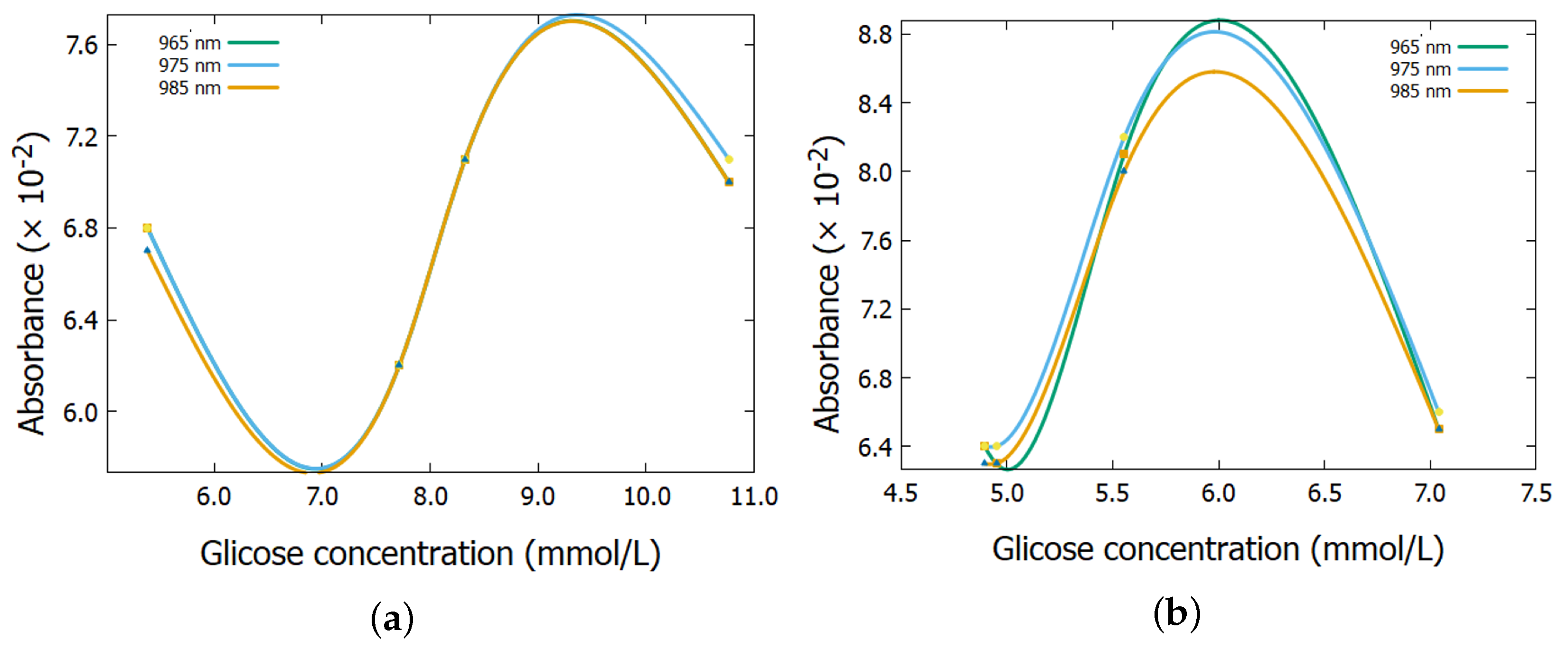 Figure 5 show the absorbance spectrum as a function of glucose concentration for the two subjects, considering the wavelengths of 965 nm, 975 nm, and 985 nm. It is observed that, in both cases, the curves exhibit a nonlinear behavior, similar to previous tests [