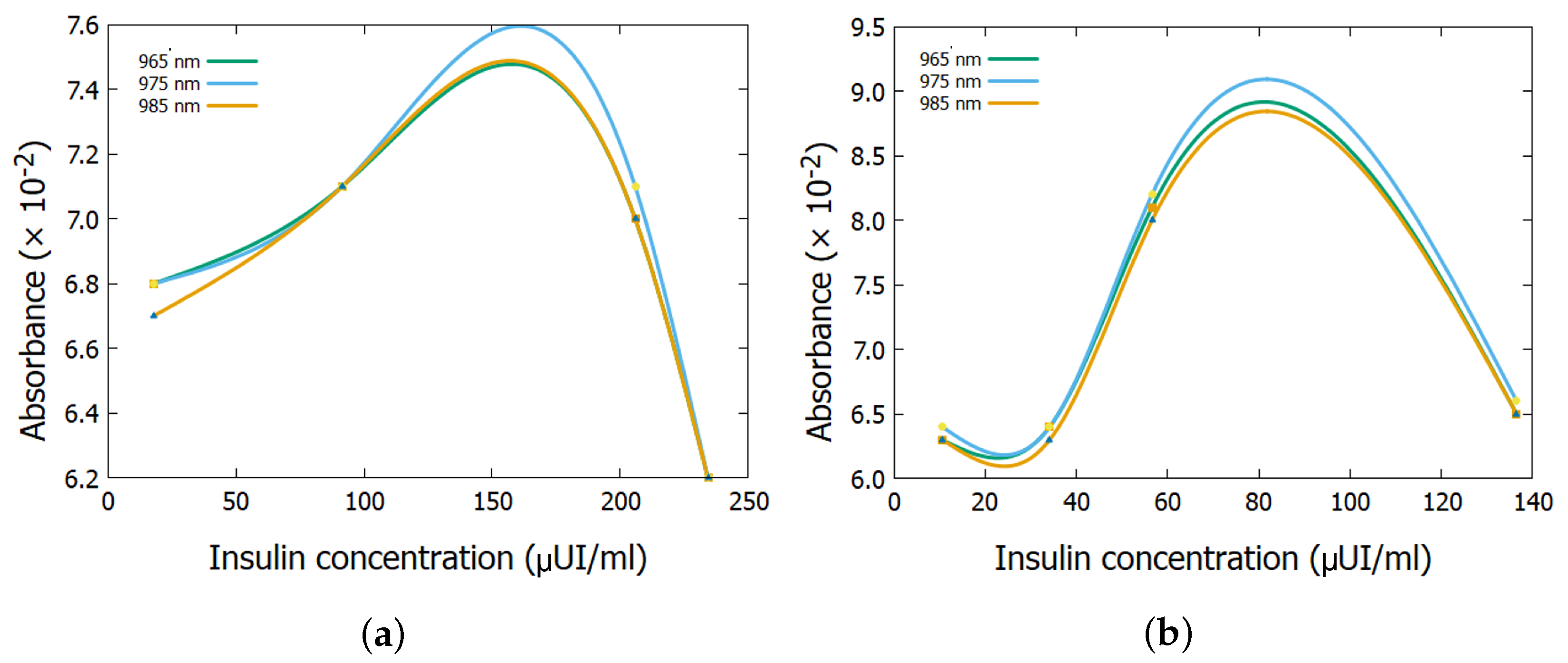 28], particularly the absorbance graphs as a function of glucose concentration, highlight the nonlinearity with wavelength. This behavior motivated the inclusion of insulin dosage as a differentiator in this last experiment. During glucose measurements, it was known that other blood components underwent changes in their volume fractions. However, their contributions to absorption were mitigated by using fasting samples as blanks. Nevertheless, insulin was considered the most significant analyte that could not be ignored in improving the methodology.