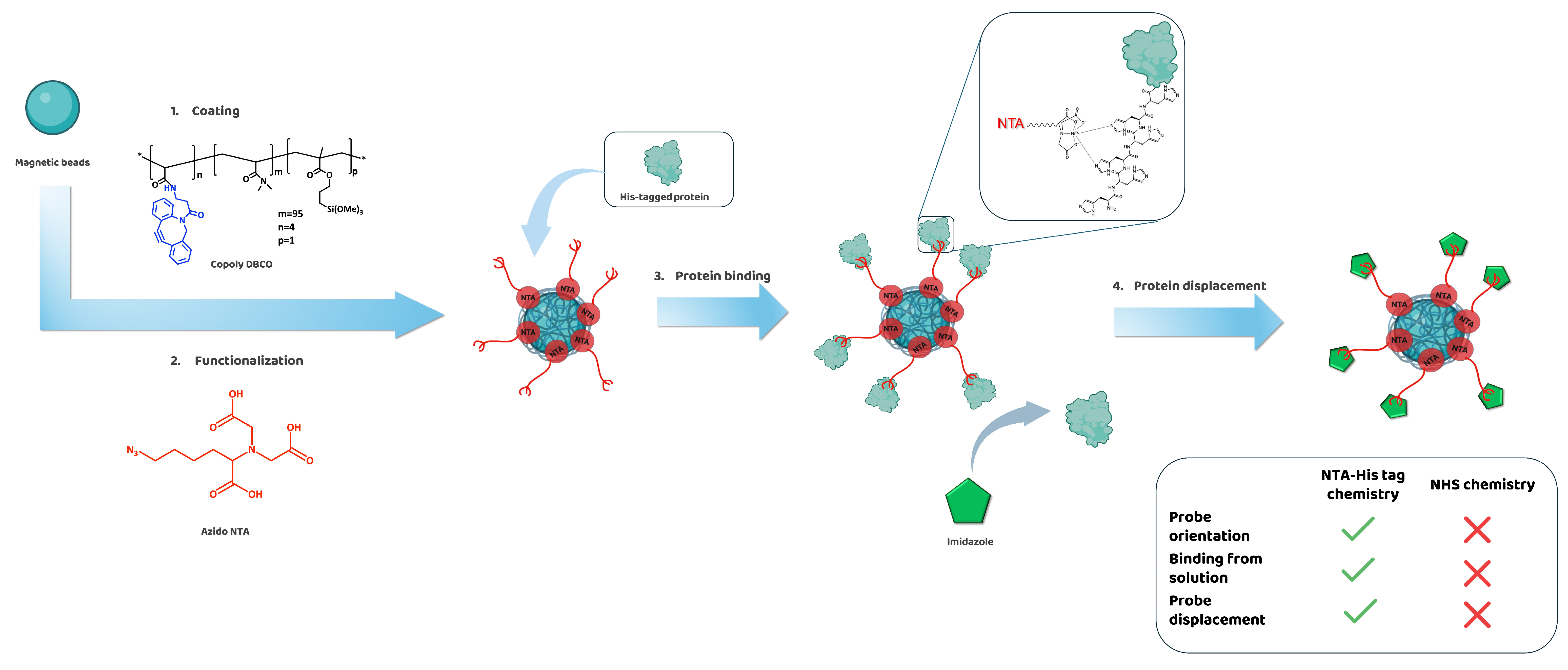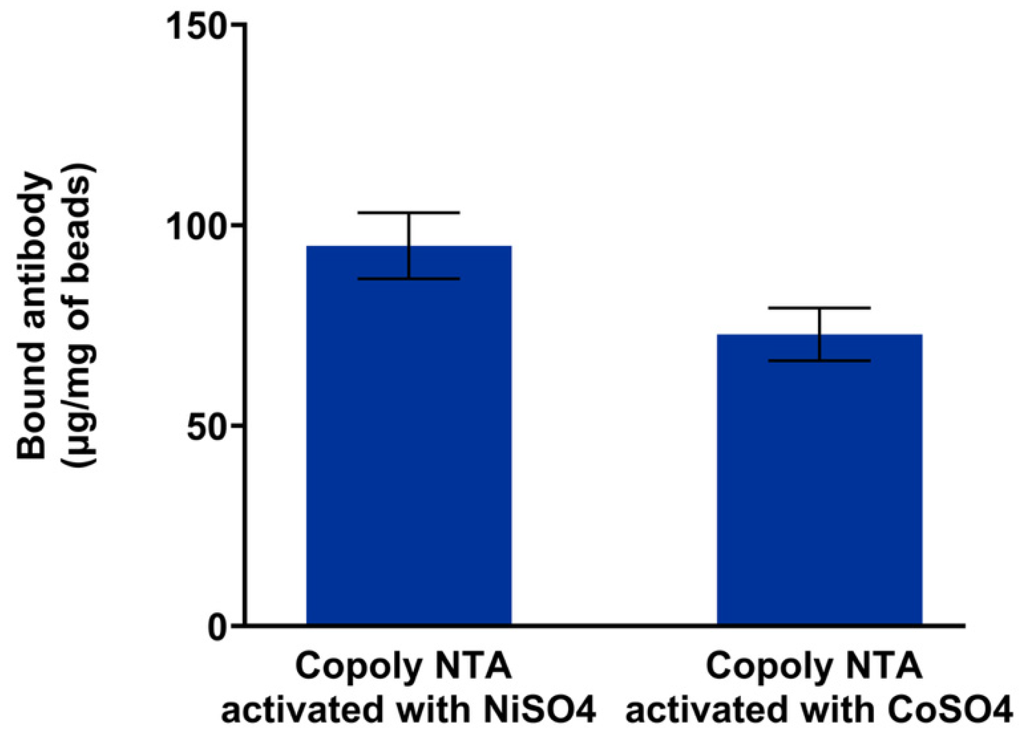 As previously mentioned, the Fc region of antibodies contains two histidine residues that can be utilized for immobilization via metal–NTA chemistry. In this study, magnetic beads (1 µm in diameter) were coated with Copoly DBCO. After functionalization with NTA and the subsequent treatment with NiSO