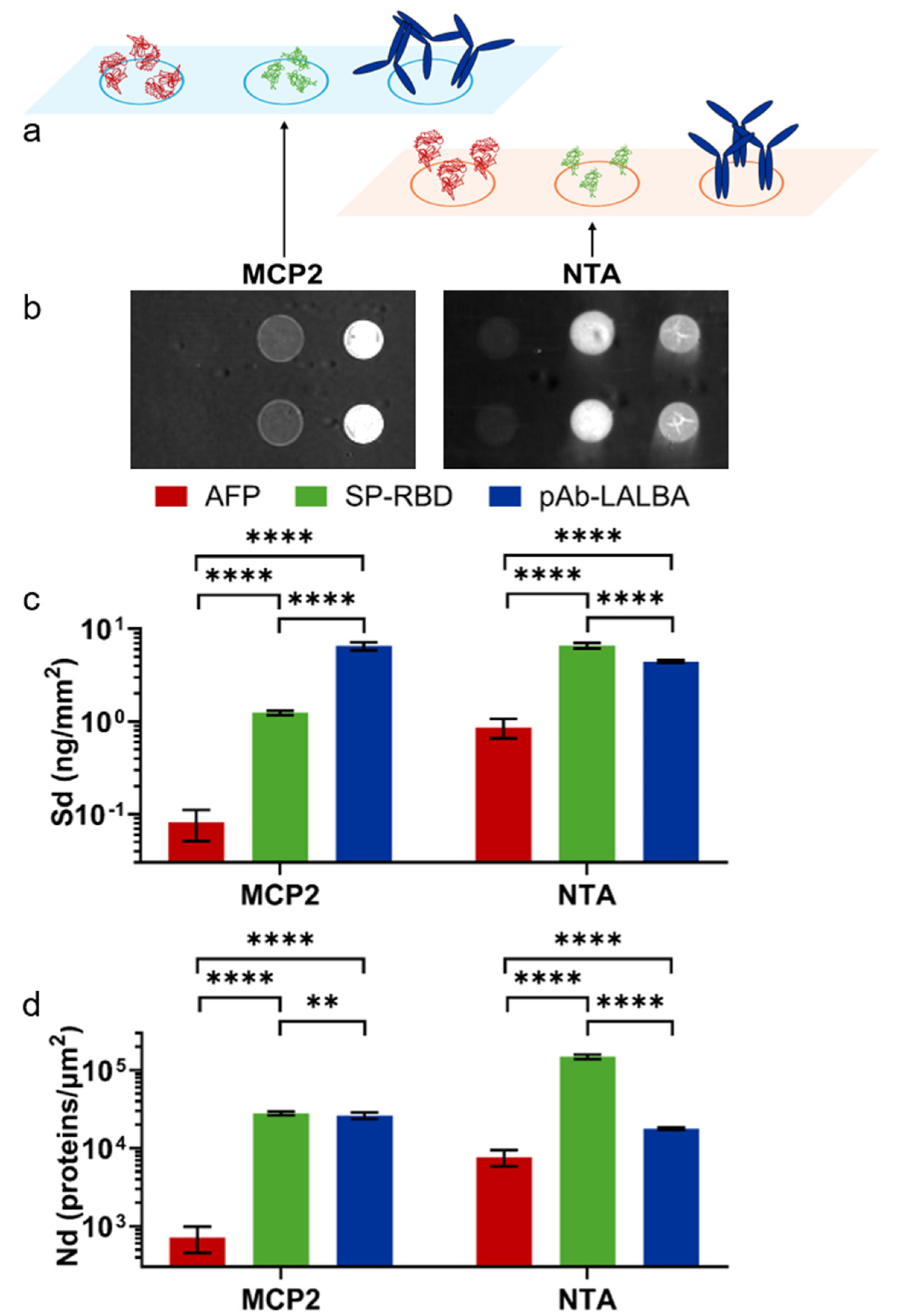 Figure 2b,c). The Sd from the His-tagged SARS-CoV-2 Spike RDB increased due to the effective immobilization facilitated by the interaction between the NTA ligand and the exposed histidine tag. An even larger improvement in the Sd of Alpha-Fetoprotein was observed, although the yield remained much smaller than that of the other proteins. In contrast, the number of immobilized antibodies showed a slight decrease relative to the case of MCP-2 coating, which was ascribed to the smaller efficiency of the native histidine residue of the antibody for binding onto NTA relative to the His-tagged proteins. The conversion of Sd to the number density Nd reported in