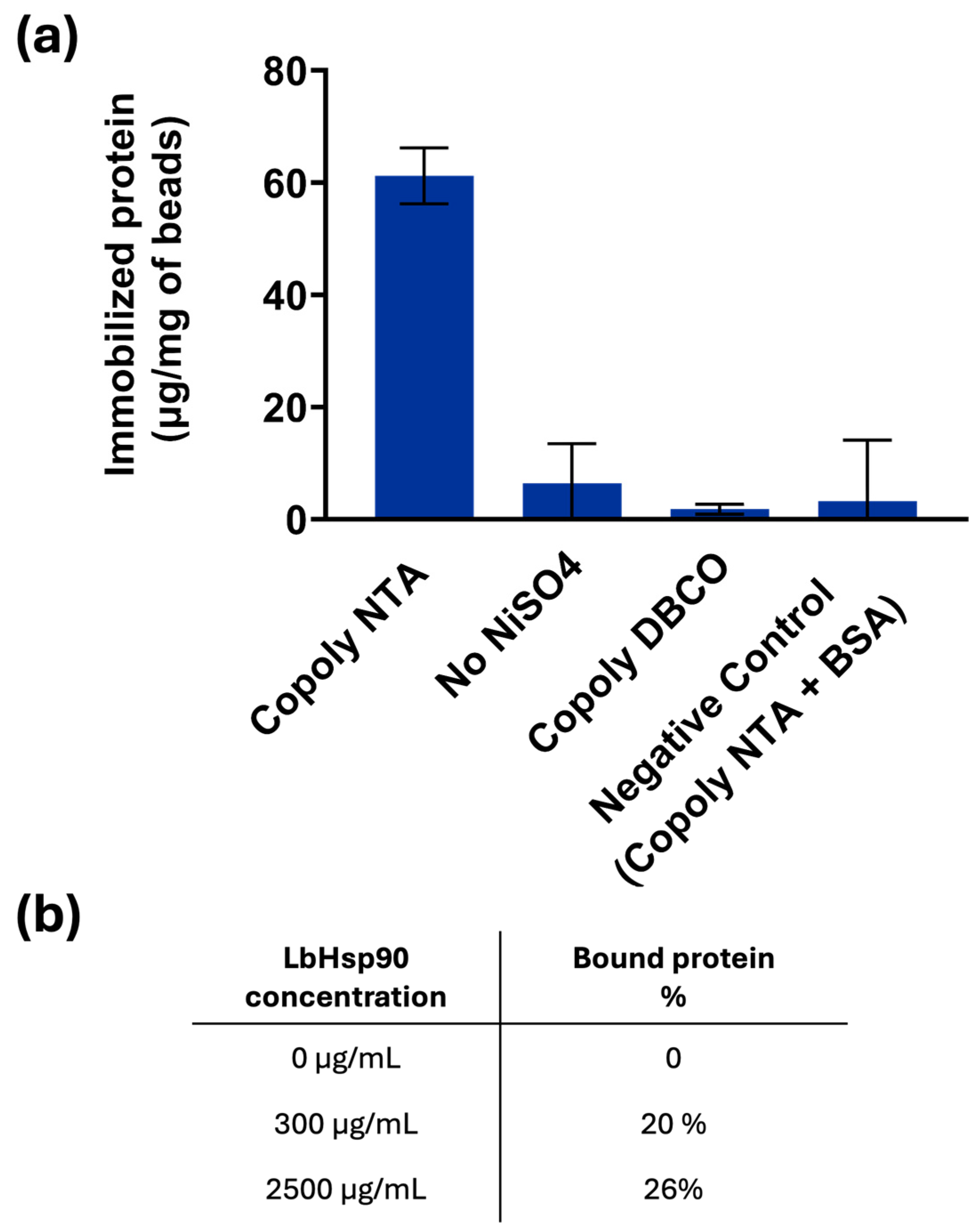 Controls included the following: (i) Copoly NTA without metal, (ii) Copoly DBCO only, both with His-tagged LbHsp90, and (iii) Copoly NTA with metal incubated with BSA (600 µg/mL) to assess non-specific binding. A separate BSA calibration curve was used for quantification. Each condition was tested in triplicate. More details on the experimental setup are reported in the SM.