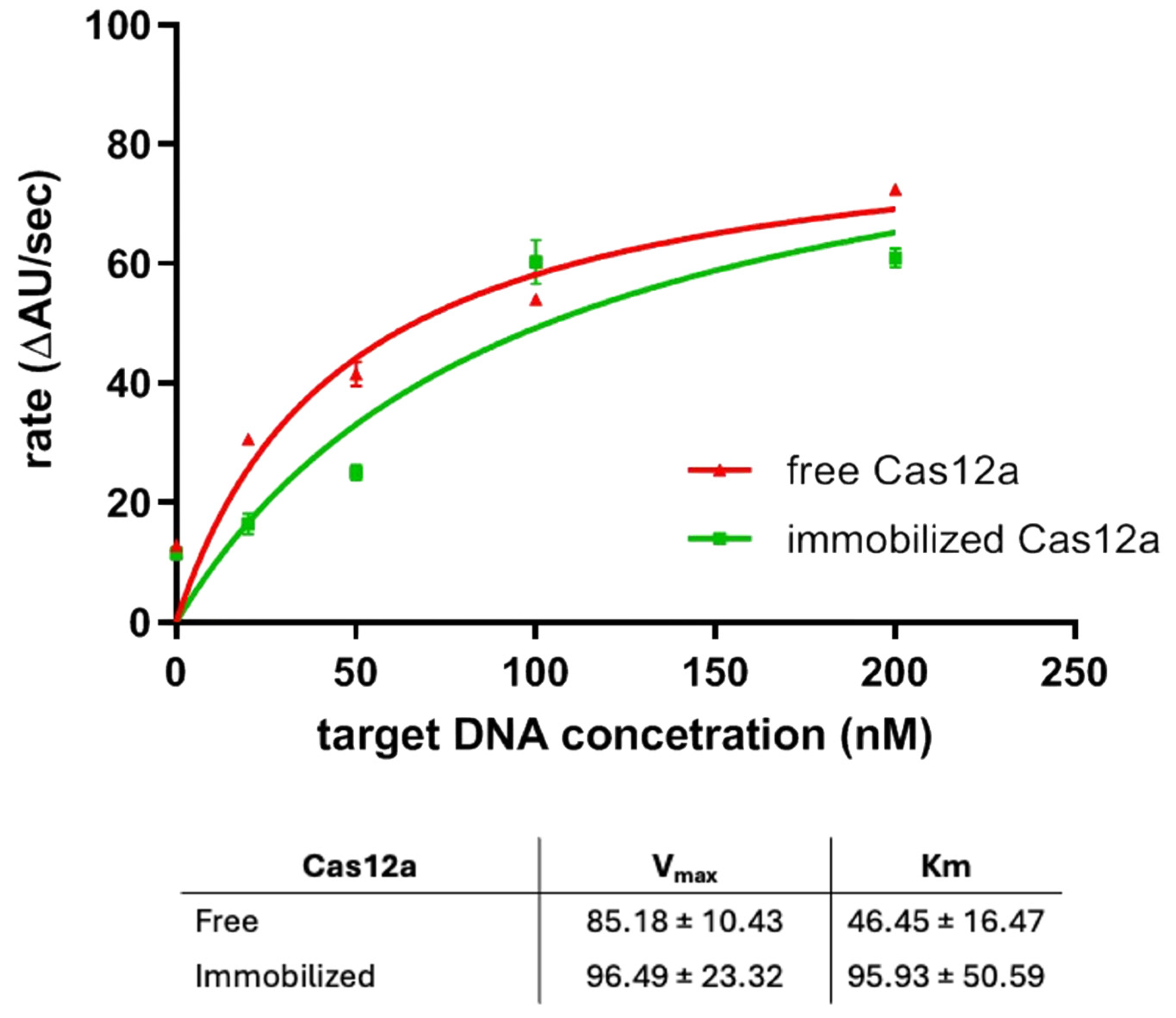 m for the immobilized enzyme is approximately double that of the free enzyme, suggesting a lower apparent affinity for the substrate. This could be due to diffusion limitations, steric hindrance, or microenvironmental effects introduced by the immobilization matrix. Overall, the data strongly support that CRISPR-Cas12a retains its catalytic efficiency upon immobilization. This validates the effectiveness of the immobilization strategy on Copoly NTA-coated magnetic beads and confirms that the enzyme remains functionally active and properly oriented on the bead surface.