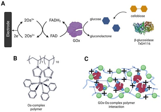Redox polymers bearing osmium (Os) complexes have been widely employed for the co-immobilization with GOx, enabling electron transfer from the enzymatic oxidation of glucose to the electrode surface via a mediated electron transfer (MET) pathway through an electron-hopping mechanism [,,]. In addition to facilitating efficient electron shuttling, redox polymers support the entrapment of large quantities of redox enzymes, forming multilayered enzyme assemblies. The resulting redox hydrogel provides a three-dimensional network that promotes rapid substrate diffusion and enhances charge transport across the film [].