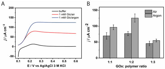 The influence of the GOx-to-redox-polymer ratio on the current density was investigated under both oxygenated and deoxygenated (argon-saturated) conditions, as shown in Figure 2B. Previous studies have reported negative effects of oxygen on the current output of GOx-modified electrodes [,]. Two mechanisms have been proposed to explain this effect: (i) oxygen can react with the reduced form of GOx, producing hydrogen peroxide (H2O2), which may degrade the electrode components, and (ii) oxygen competes with the redox mediator in re-oxidizing GOx, thereby hindering efficient electron transfer []. Consistent with these reports, our results show that current densities measured in air-equilibrated electrolyte were significantly lower than those obtained in argon-saturated conditions (Figure 2).