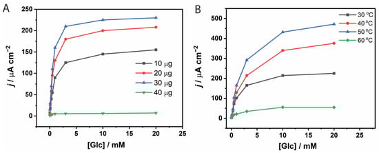 (A) Current densities of GOx-modified electrodes with different GOx loadings (10–40 μg) in citrate buffer pH 5.5 and 30 °C. (B) Current densities of the GOx-modified electrode at different temperatures (30–60 °C) and glucose concentrations (0.02–20 mM) at an applied potential of 0.28 V (vs Ag/AgCl 3 M KCl) under argon-saturated electrolyte and a stirring speed of 1000 rpm.