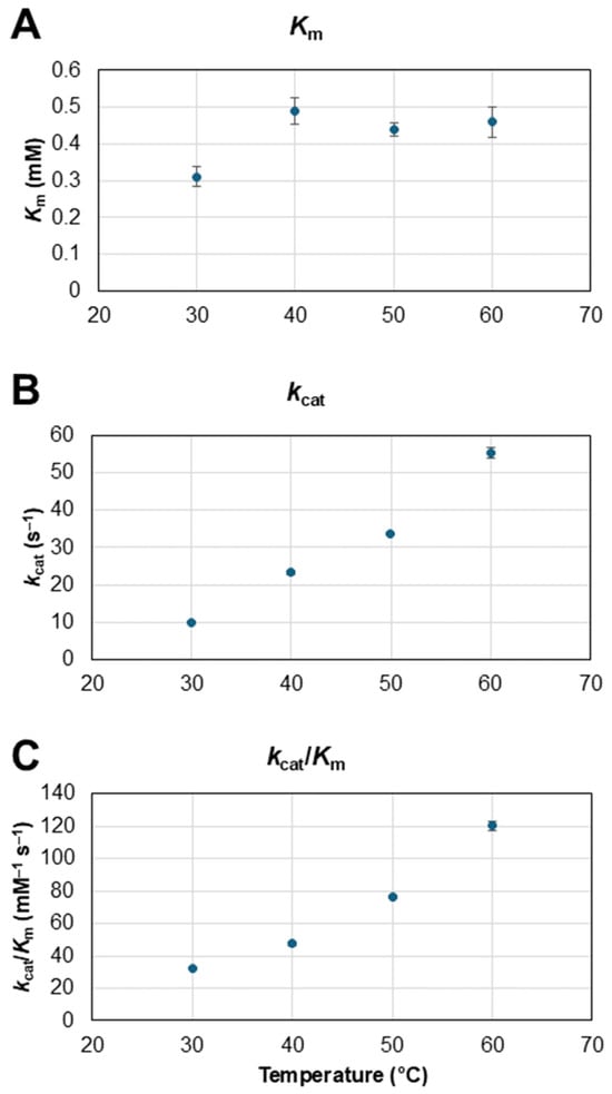 Effect of temperature on TxGH116 kinetics for hydrolysis of cellobiose. Effect of temperature on apparent values for (A) Km, (B) kcat and (C) kcat/Km for TxGH116 hydrolysis of cellobiose were assessed with 10 nM TxGH116 in 50 mM sodium acetate, pH 5.5, in 20 min reactions at the designated temperatures.
