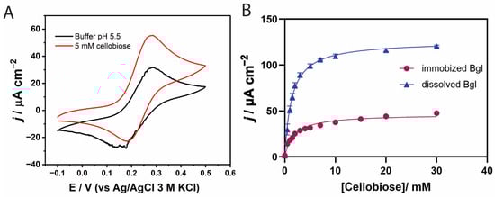 We investigated the electrochemical behavior of the enzyme-modified electrode using cyclic voltammetry. The cyclic voltammogram of the co-immobilized GOx/β-glucosidase in the redox hydrogel-modified bioanode is shown in Figure 5A. In the absence of cellobiose, the voltammogram exhibited quasi-reversible redox peaks corresponding to the Os3+/Os2+ redox couple, with a half-wave potential (E1/2) of 0.23 V, consistent with previous reports using the same polymer matrix []. Following the addition of cellobiose, the electrolyte was incubated with the modified electrode for 15 min to allow for hydrolysis by β-glucosidase. The resulting voltammogram displayed an increased anodic current associated with glucose oxidation at the electrode surface, accompanied by a cathodic peak shift of approximately 25 mV compared to the cellobiose-free condition. This observation indicates successful electron mediation between the FAD redox centers in GOx and the Os-complex in the polymer matrix.