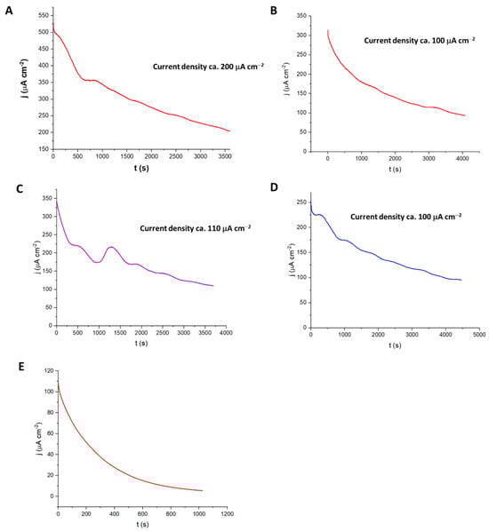 Current densities generated over time recorded at the GOx/PVI-Os(bpy)2Cl2/GCE bioanode at constant applied potential of 0.28 V vs Ag/AgCl 3 M KCl at 40 °C with sugarcane leaf (SCL) biomass substrate. (A) 1% SCL pretreated with sodium carbonate digested with 1% cellulase and 0.2 mg TxGH116 β-glucosidase, the solution was stirred at 400 rpm. (B) 1% SCL pretreated with 1% cellulase alone. (C) 1% SCL pretreated with sodium hydroxide and digested with 1% cellulase and 0.2 mg TxGH116 β-glucosidase. (D) 1% SCL pretreated with sodium hydroxide and digested with 1% cellulase alone. (E) 1% SCL pretreated with phosphoric acid and digested with 1% cellulase and 0.2 mg TxGH116 β-glucosidase.