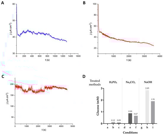 Current densities generated over time recorded at the GOx/PVI-Os(bpy)2Cl2/GCE bioanode at constant applied potential of 0.28 V vs Ag/AgCl 3 M KCl at 40 °C with sugarcane leaf biomass substrate in the solution under stirring at 400 rpm. (A) 1% SCL pretreated with phosphoric acid digested with 3 mg ThCel6A and 0.2 mg TxGH116 β-glucosidase. (B) 1% SCL pretreated with sodium carbonate digested with 3 mg ThCel6A and 0.2 mg TxGH116 β-glucosidase. (C) 1% SCL pretreated with sodium hydroxide digested with 3 mg ThCel6A and 0.2 mg TxGH116 β-glucosidase. (D) Glucose concentration determination by PGO assay from the hydrolysis of 1% SCL using ThCel6A and β-glucosidase pretreated with different chemicals: a: 1% SCL treated with phosphoric acid; b: 1% SCL treated with phosphoric acid before current measurement; c: 1% SCL treated with phosphoric acid after current measurement; d: 1% SCL treated with Na2CO3; e: 1% SCL treated with Na2CO3 before current measurement; f: 1% SCL treated with Na2CO3 after current measurement; g: 1% SCL treated with NaOH; h: 1% SCL treated with NaOH before current measurement; i: 1% SCL treated with NaOH after current measurement.