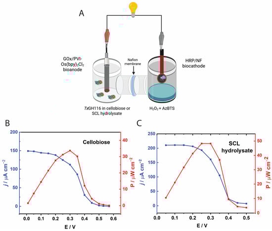 (A) Schematic diagram of the BFC assembled in a two-compartment electrochemical cell separated by a Nafion™ 117 membrane. Panel A was created in BioRender. Pinyou, P. (2025) https://BioRender.com/fbytq6b. Panel B Cellobiose (B) Polarization (blue) and power density (red) curves of the BFC comprised a GOx/PVI-[Os(bpy)2Cl]2-modified GCE bioanode operating in 30 mM cellobiose and 93 μg TxGH116 β-glucosidase dissolved in citrate buffer (pH 5.5) under argon-saturated electrolyte and stirring at 400 rpm, and an HRP/NF/graphene biocathode immersed in 0.1 M phosphate buffer (pH 6.0) containing 0.15 M NaCl, 10 mM H2O2, and 1 mM AzBTS at 40 °C under air-equilibrated conditions. Panel C Biomass-derived fuel (SCL hydrolysate) (C) Polarization and power density curves of the BFC assembled in a two-compartment electrochemical cell consisting of GOx/PVI-[Os(bpy)2Cl]2-modified GCE bioanode in the 1% SCL pretreated with Na2CO3 hydrolysates hydrolyzed with the commercial cellulase at 40 °C under argon-saturated electrolyte and stirring at 400 rpm.