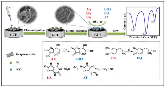 - Gao, J.; He, P.; Yang, T.; Zhou, L.; Wang, X.; Chen, S.; Lei, H.; Zhang, H.; Jia, B.; Liu, J. Electrodeposited NiO/Graphene Oxide Nanocomposite: An Enhanced Voltammetric Sensing Platform for Highly Sensitive Detection of Uric Acid, Dopamine and Ascorbic Acid. J. Electroanal. Chem. 2019, 852, 113516. [Google Scholar] [CrossRef]