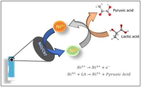 Nickel oxide (NiO) nanoparticles integrated with carbon nanotubes (CNTs), especially multi-walled carbon nanotubes (MWCNTs), have emerged as promising materials for the development of high-performance electrochemical sensors. These hybrid systems leverage the redox-active nature of NiO and the excellent electrical conductivity and high surface area of CNTs, offering a synergistic platform for enhanced biosensing. A solvent-free approach has been employed to synthesize NiO-decorated MWCNT composites. The composite was used to fabricate an enzyme-free carbon paste electrode (CPE) for glucose detection. Among various formulations, the 10% NiO–MWCNT-based electrode demonstrated the best performance, achieving high sensitivities of 1696 and 122.1 µA·mM−1·cm−2 for glucose concentration ranges of 1–200 µM and 0.5–9.0 mM, respectively. The sensor also exhibited low detection limits (11.04 nM and 31 µM), along with high selectivity, reproducibility, and long-term stability, making it suitable for reliable non-enzymatic glucose monitoring [9]. A coaxial nanostructured composite of NiO, CNTs, and poly(3,4-ethylenedioxythiophene) (PEDOT) was fabricated via an electrochemical deposition strategy. This composite, when deposited onto a glassy carbon electrode (GCE), enabled the simultaneous electrochemical detection of dopamine (DA), serotonin (5-HT), and tryptophan (Trp). The presence of distinct oxidation peaks and linear responses for the analytes in micromolar ranges, with detection limits of 0.026 µM (DA), 0.063 µM (5-HT), and 0.210 µM (Trp), demonstrated the composite’s strong electrocatalytic activity due to the synergistic effects of the three components [16]. Atomic layer deposition (ALD) was utilized to uniformly anchor NiO nanoparticles (∼4.9 nm) onto CNT walls, creating a nanocomposite for the detection of hydroquinone (HQ) and catechol (CC). The resulting NiO/CNT-modified GCE exhibited enhanced redox peak separation and current responses. Detection limits were reported at 2.5 µM for both analytes, with linear ranges from 10 to 500 µM for HQ and 10–400 µM for CC, validating the nanocomposite’s application for environmental monitoring [85]. NiO was coated onto stacked-cut CNTs via ALD with varying cycles, and the resulting composites were evaluated for lactate sensing using a screen-printed carbon electrode configuration. Electrochemical measurements showed that the sample with 200 ALD cycles had optimal performance, delivering a sensitivity of 138.44 µA·mM−1·cm−2 and a low detection limit of 67 µM. The sensor demonstrated excellent analytical performance in human saliva, offering a non-invasive platform for lactate monitoring [86]. The probable mechanism for LA detection is shown in Figure 2.