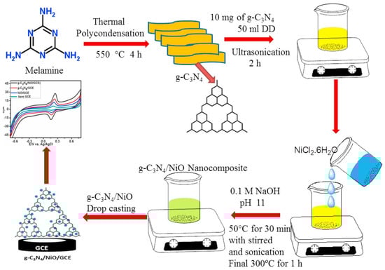 Graphitic carbon nitride (g-C3N4), owing to its unique electronic structure, excellent chemical stability, and facile synthesis, has emerged as a promising candidate for the development of electrochemical sensors. The integration of g-C3N4 with metal oxides such as nickel oxide (NiO) further enhances its surface area, charge transfer ability, and catalytic efficiency. This section presents a comprehensive overview of recent advancements in g-C3N4/NiO-based electrochemical sensors, focusing on their applications in the sensitive and selective detection of various drugs and biomolecules. A highly sensitive sensor for acetaminophen (AAP), an antipyretic and analgesic agent, was developed using a silver-decorated NiO/g-C3N4 nanocomposite synthesized via a sol–gel method followed by ultrasonic treatment. The modified glassy carbon electrode (Ag@NiO/g-C3N4/GCE) exhibited superior electrocatalytic activity, as demonstrated by cyclic voltammetry (CV) and differential pulse voltammetry (DPV) in phosphate-buffered saline (PBS, pH 7.0). The sensor displayed a linear detection range of 10 µM to 1 mM and a detection limit of 0.76 µM. High selectivity against interfering substances such as glucose, uric acid, and common salts affirmed its practical applicability [92]. Hydrogen peroxide (H2O2), extensively used in industrial and healthcare sectors, poses toxicity risks at elevated concentrations. A hydrothermal method followed by calcination at various temperatures (350–450 °C) was used to fabricate g-C3N4/NiO composites (CNNi-1, CNNi-2, CNNi-3). CNNi-2, exhibiting optimal hierarchical morphology and mesoporosity, was deposited on fluorine-doped tin oxide (FTO) substrates via spray pyrolysis. The electrode showed excellent electrochemical performance in H2O2 detection, with a broad linear range (0.001–0.750 μM), high sensitivity, and a low detection limit (0.10 ± 0.04 μM). The sensor-maintained stability over 8 weeks and demonstrated reproducibility (RSD = 3.23%) and practical utility in biological and environmental samples [93]. In another report, NiO/g-C3N4 hybrids, synthesized hydrothermally using melamine and Ni(OH)2 precursors, were explored for glucose detection applications. The optimal composition demonstrated exceptional glucose sensing sensitivity (5387.1 µA mM−1cm−2). A flexible, self-powered glucose sensor was also developed, integrating the same nanocomposite as sensing unit, suggesting potential for wearable diagnostic systems [94]. A one-pot synthesis approach yielded a g-C3N4/NiO nanocomposite for quercetin (QR) detection. The synthesis of the proposed material has been illustrated in Figure 3.