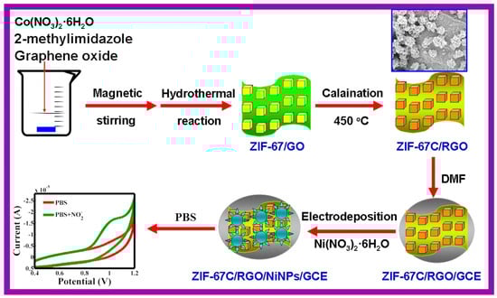 A non-enzymatic glucose sensor was constructed from 2D NiO/Co3O4@C heterojunctions obtained by pyrolyzing NiO@ZIF-67. The Nafion-modified sensor exhibited wide linear detection ranges (5–1000 μM and 1–4 mM) and high sensitivities (690 and 215.4 μA·mM−1·cm−2), with good recovery in serum samples and excellent reproducibility [108]. We have also included Ni NPs based composite with ZIF and RGO for the determination of nitrite as shown in Figure 4 [109]. The carbonized ZIF-67 (ZIF-67)/RGO/ Ni NPs modified electrode was used as nitrite sensor.