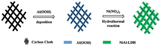Schematic representation of the fabrication of NiAl-LDH using hydrothermal method on carbon cloth. Reprinted with permission [125].