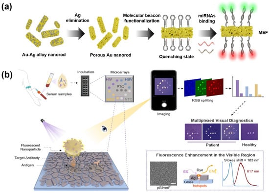 - Choi, M.Y.; Park, D.H.; Choi, J.-H. Multiplex Metal Enhanced Fluorescence (MEF) Effect on Porous Au Nanorod for Highly Sensitive Multi-MicroRNA (MiRNA) Detection. Sens. Actuators B Chem. 2023, 393, 134280. [Google Scholar] [CrossRef]