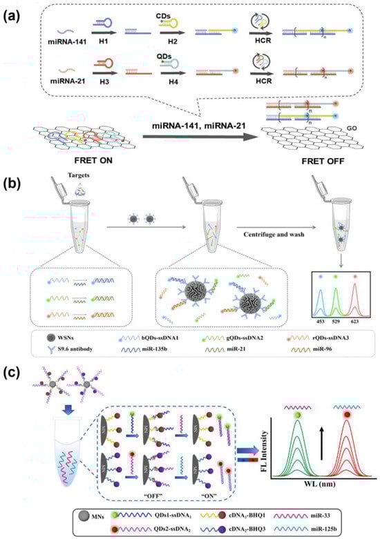 - Liu, L.; He, J.H.; Wu, X.Q.; Liu, J.J.; Lv, W.Y.; Huang, C.Z.; Liu, H.; Li, C.M. Simultaneous Detection of Multiple MicroRNAs Based on Fluorescence Resonance Energy Transfer under a Single Excitation Wavelength. Spectrochim. Acta A Mol. Biomol. Spectrosc. 2024, 322, 124788. [Google Scholar] [CrossRef] [PubMed]