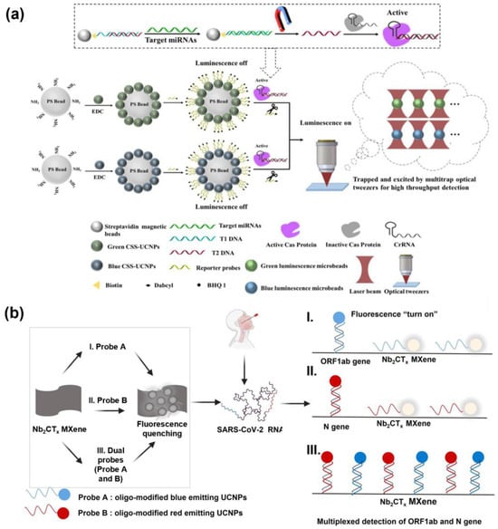- Yu, H.; Xu, P.-F.; Liu, Y.; Jia, Z.-S.; Li, Y.-Y.; Tang, H.-W. LRET-Based Simultaneous Detection of Dual MiRNAs via Multitrap Optical Tweezers Assisted Suspension Array Tagged by Two Different Luminescent Quenchable UCNPs Combining CRISPR/Cas12a Amplification. Anal. Chem. 2025, 97, 602–612. [Google Scholar] [CrossRef] [PubMed]