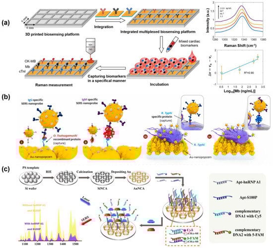 - Zheng, P.; Wu, L.; Raj, P.; Kim, J.H.; Paidi, S.K.; Semancik, S.; Barman, I. Multiplexed SERS Detection of Serum Cardiac Markers Using Plasmonic Metasurfaces. Adv. Sci. 2024, 11, 2405910. [Google Scholar] [CrossRef]