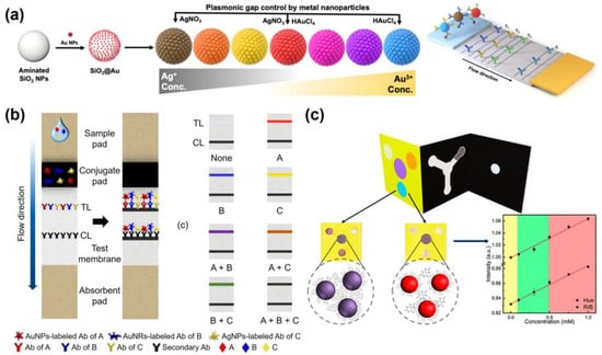 - Shin, M.; Kim, W.; Yoo, K.; Cho, H.-S.; Jang, S.; Bae, H.-J.; An, J.; Lee, J.; Chang, H.; Kim, D.-E.; et al. Highly Sensitive Multiplexed Colorimetric Lateral Flow Immunoassay by Plasmon-Controlled Metal–Silica Isoform Nanocomposites: PINs. Nano Converg. 2024, 11, 42. [Google Scholar] [CrossRef]
