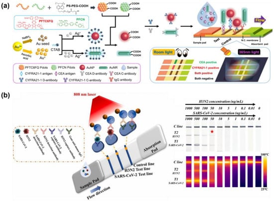- Wen, C.-Y.; Yang, X.; Zhao, T.-Y.; Qu, J.; Tashpulatov, K.; Zeng, J. Dual-Mode and Multiplex Lateral Flow Immunoassay: A Powerful Technique for Simultaneous Screening of Respiratory Viruses. Biosens. Bioelectron. 2025, 271, 117030. [Google Scholar] [CrossRef]