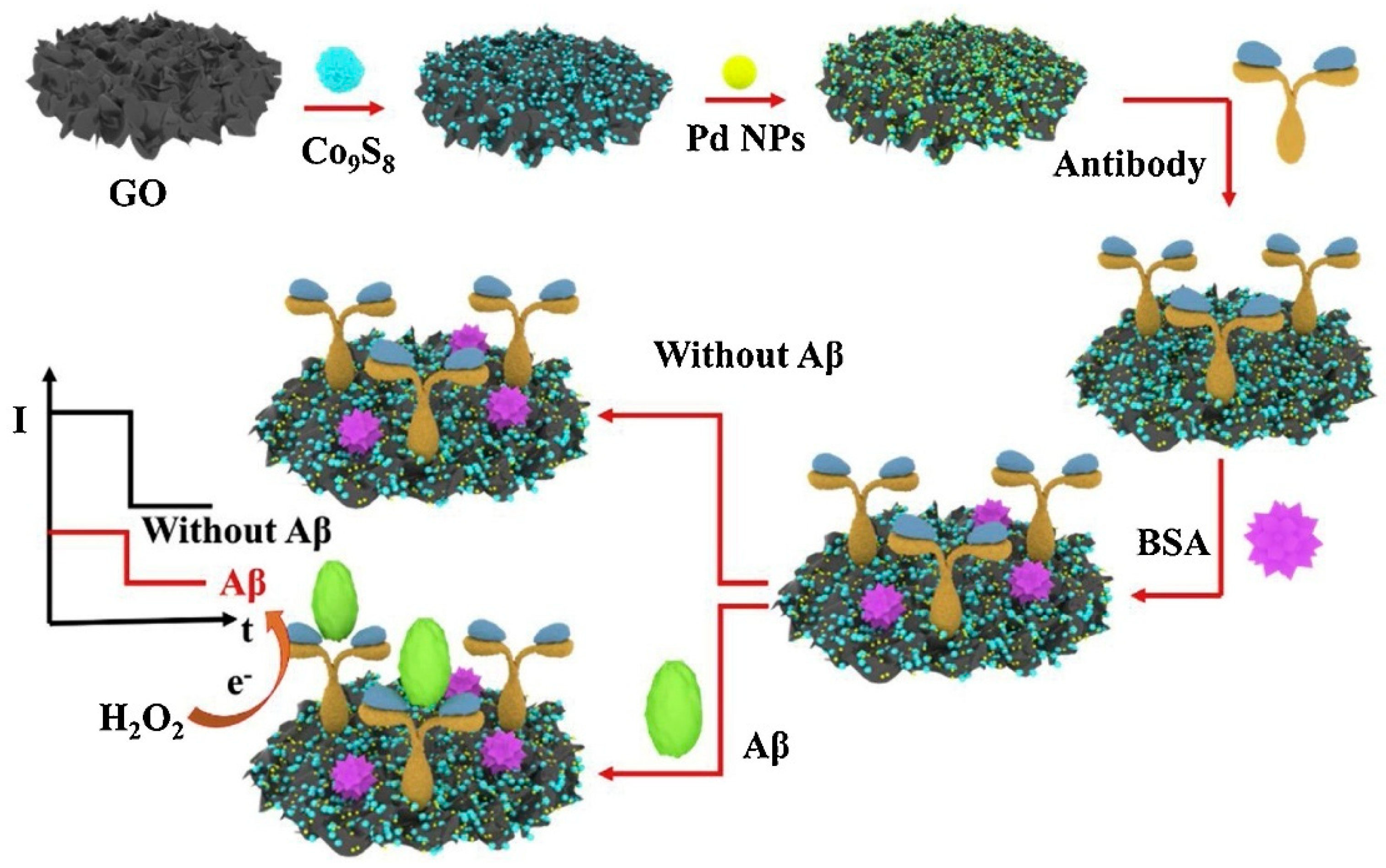 - Li, Y.; Wang, Y.; Liu, X.; Feng, R.; Zhang, N.; Fan, D.; Ding, C.; Zhao, H.; Du, Y.; Wei, Q.; et al. Bifunctional pd-decorated polysulfide nanoparticle of Co9S8 supported on graphene oxide: A new and efficient label-free immunosensor for amyloid β-protein detection. Sens. Actuators B Chem. 2020, 304, 127413. [Google Scholar] [CrossRef]