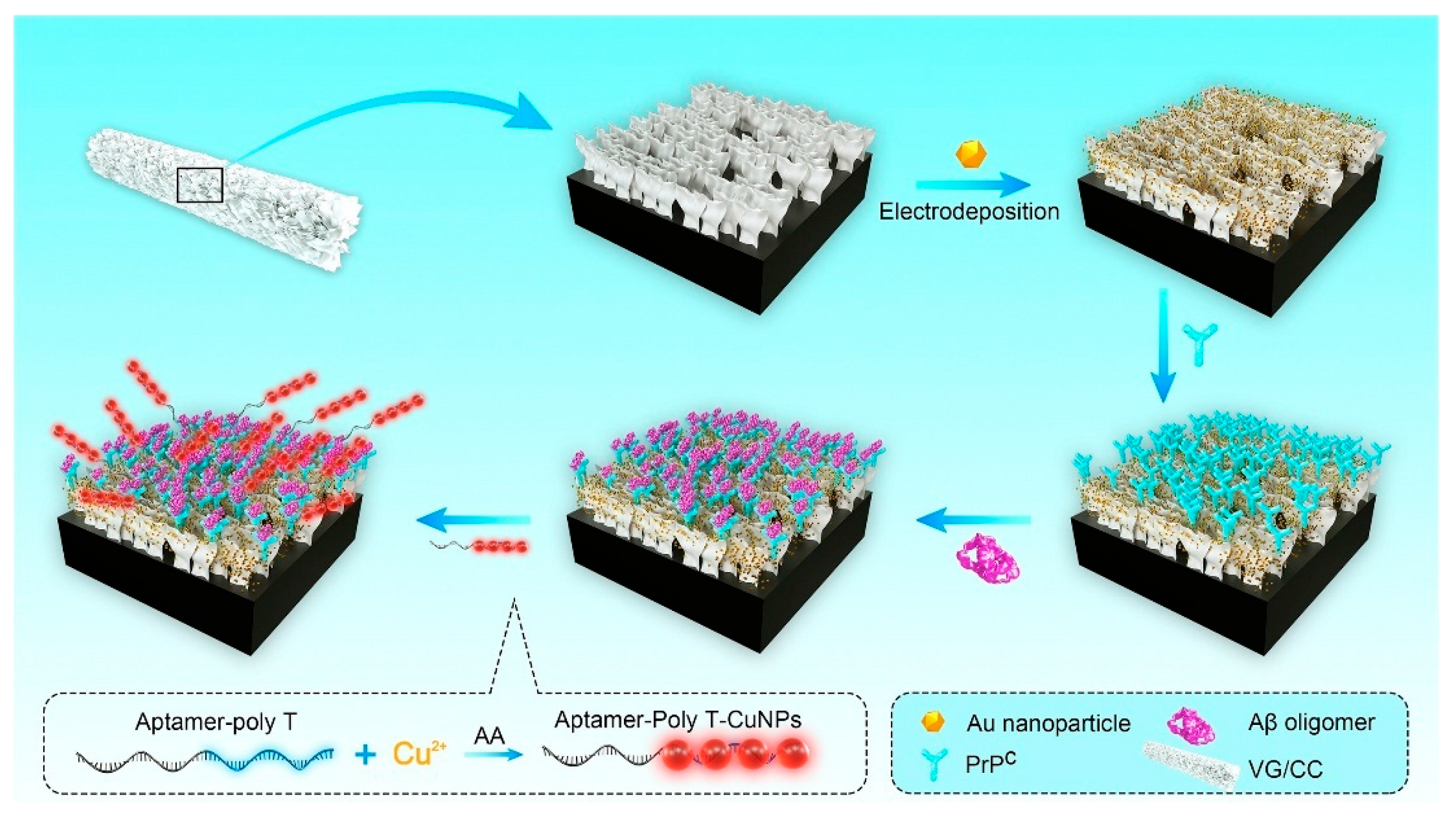 - Zhou, Y.; Lv, Y.; Dong, H.; Liu, L.; Mao, G.; Zhang, Y.; Xu, M. Ultrasensitive assay of amyloid-beta oligomers using Au-vertical graphene/carbon cloth electrode based on poly(thymine)-templated copper nanoparticles as probes. Sens. Actuators B Chem. 2021, 331, 129429. [Google Scholar] [CrossRef]