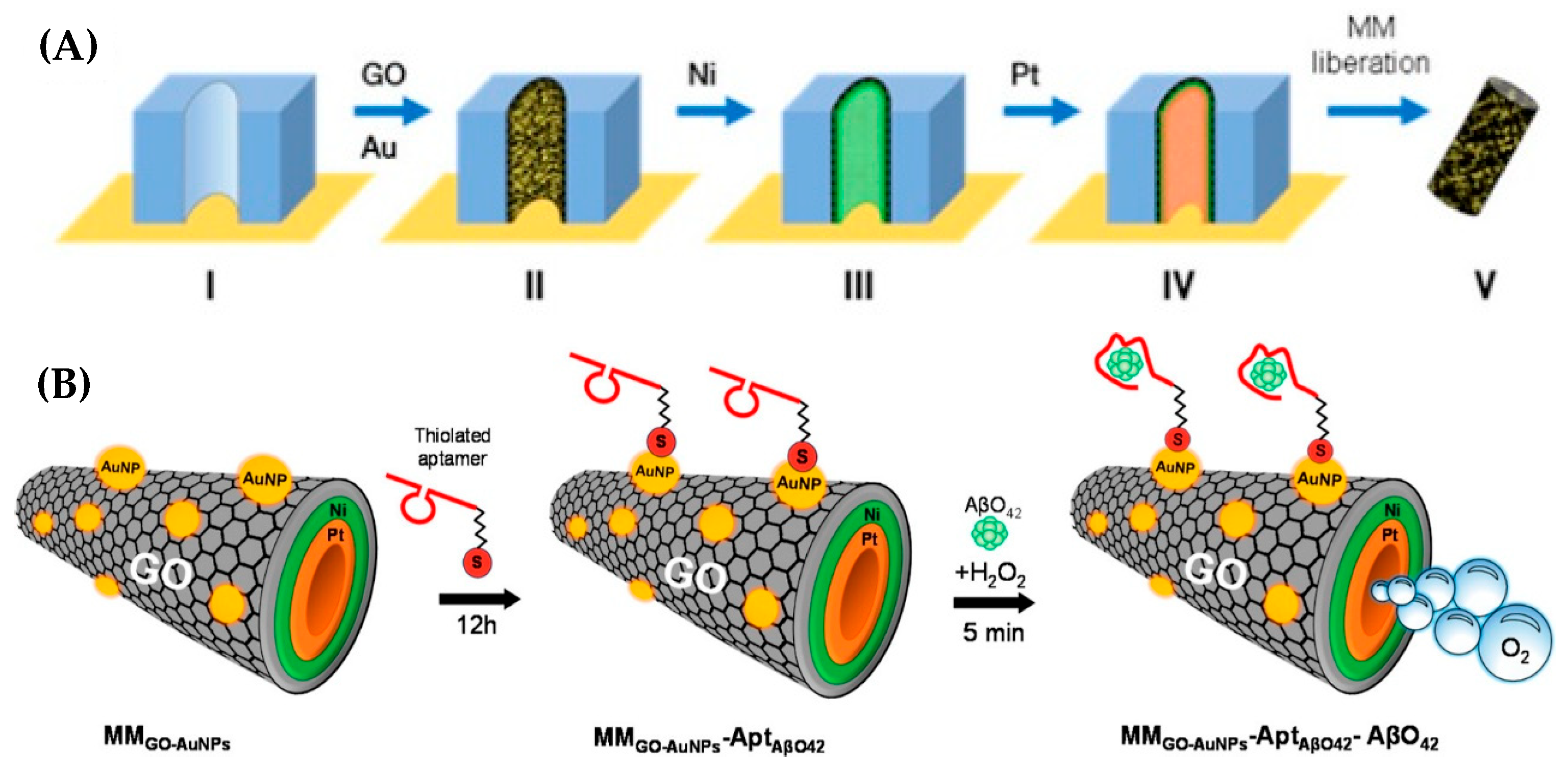 - Gallo-Orive, A.; Moreno-Guzman, M.; Sanchez-Paniagua, M.; Montero-Calle, A.; Barderas, R.; Escarpa, A. Gold Nanoparticle-Decorated Catalytic Micromotor-Based Aptassay for Rapid Electrochemical Label-Free Amyloid-beta42 Oligomer Determination in Clinical Samples from Alzheimer’s Patients. Anal. Chem. 2024, 96, 5509–5518. [Google Scholar] [CrossRef] [PubMed]