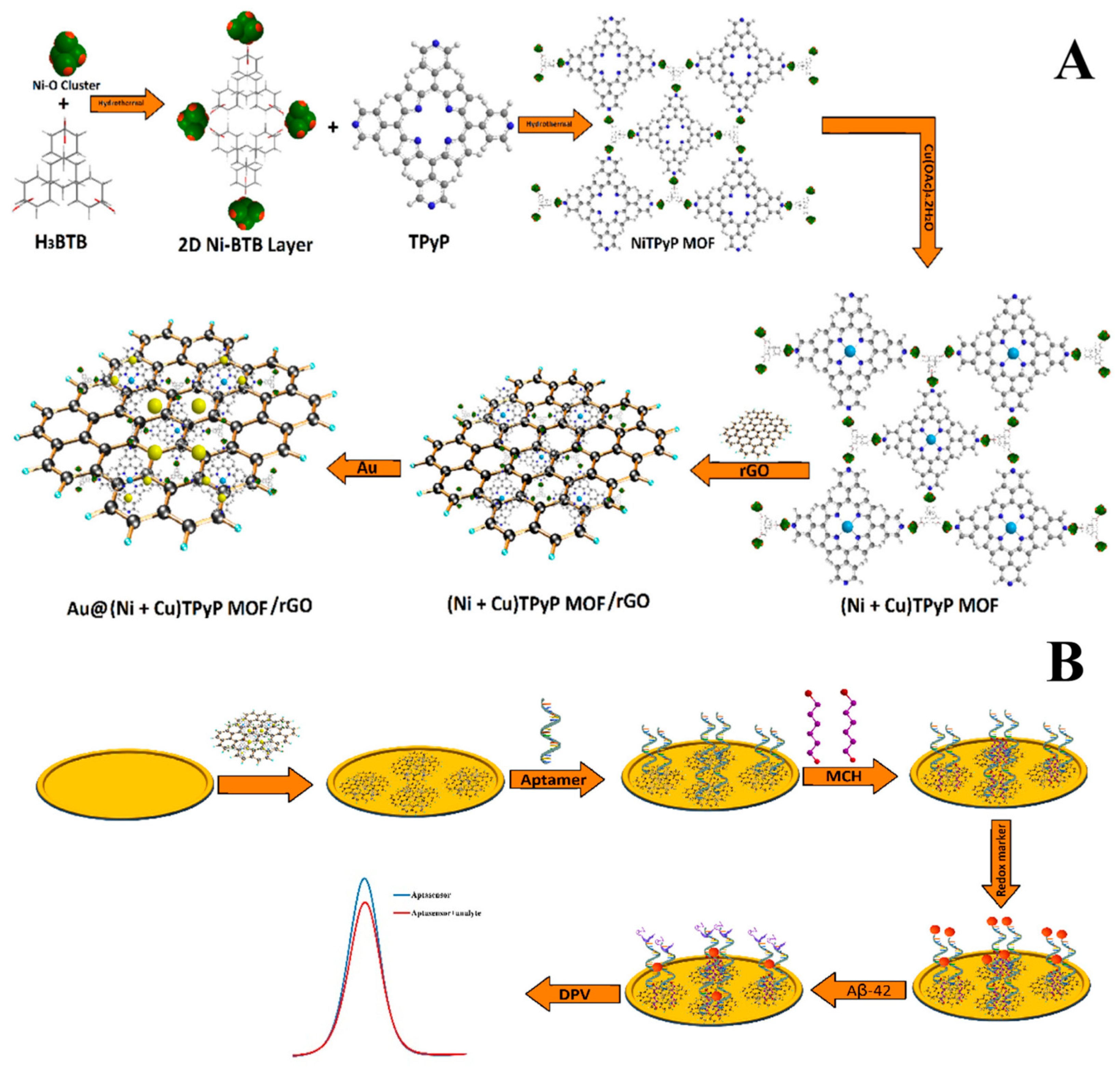 - Vajedi, F.S.; Rasoolzadeh, R.; Angnes, L.; Santos, E.C.S.; Silva, L.P.C. Ultrasensitive Aptasensing Platform for the Detection of beta-Amyloid-42 Peptide Based on MOF Containing Bimetallic Porphyrin Graphene Oxide and Gold Nanoparticles. ACS Appl. Bio Mater. 2024, 7, 2218–2239. [Google Scholar] [CrossRef]