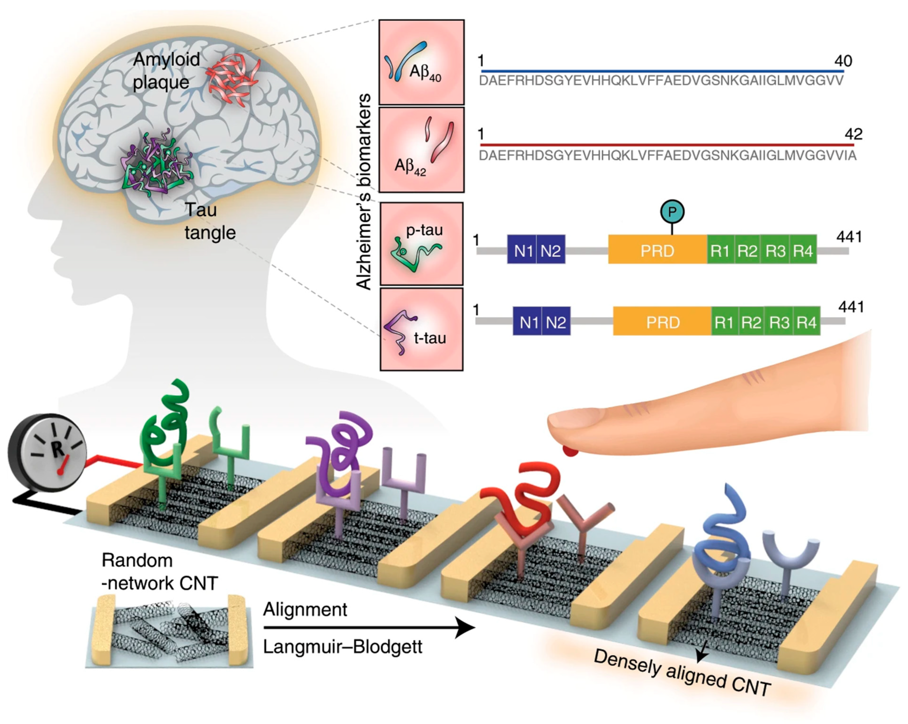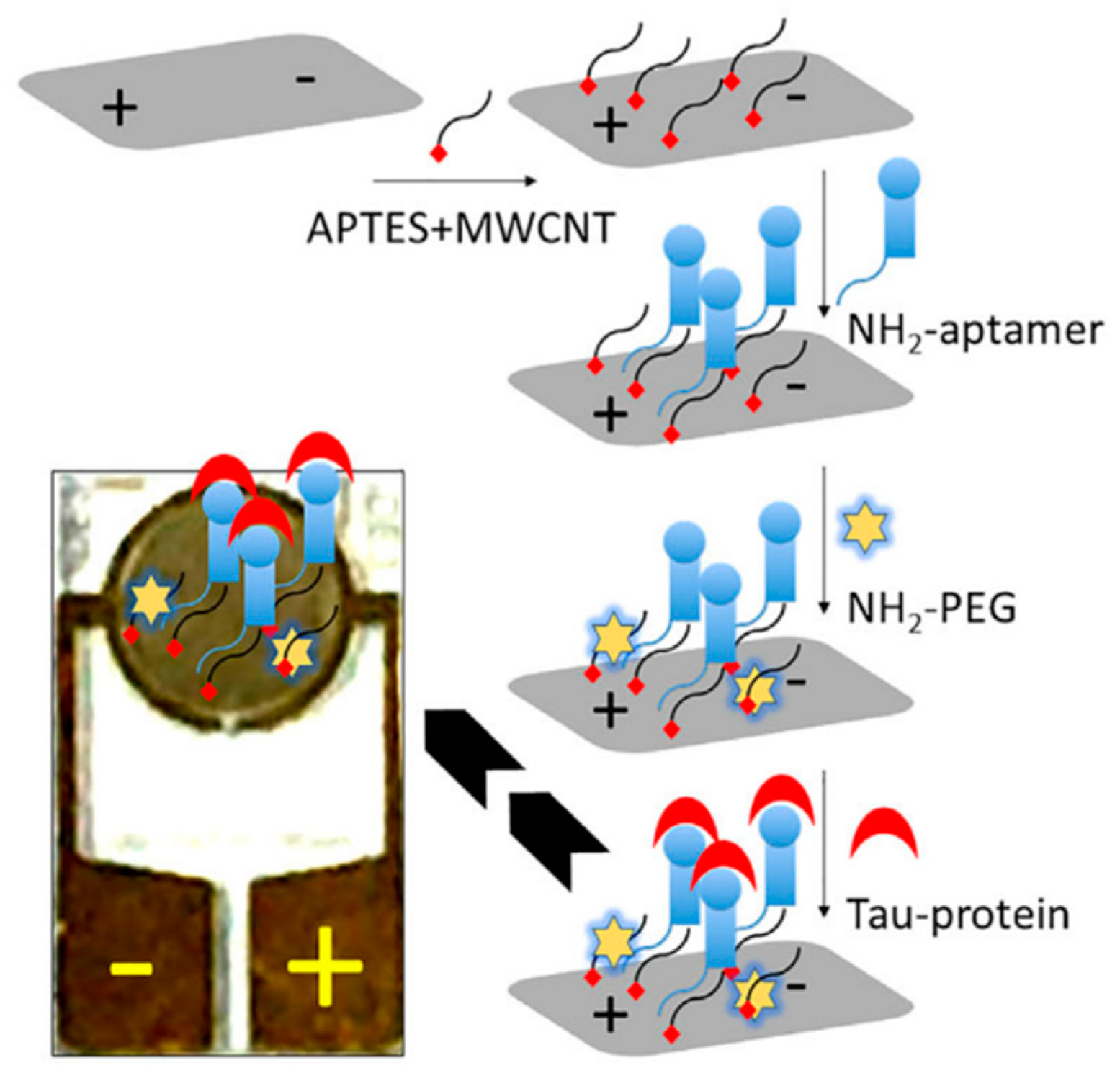 - Chen, H.; Xiao, M.; He, J.; Zhang, Y.; Liang, Y.; Liu, H.; Zhang, Z. Aptamer-Functionalized Carbon Nanotube Field-Effect Transistor Biosensors for Alzheimer’s Disease Serum Biomarker Detection. ACS Sens. 2022, 7, 2075–2083. [Google Scholar] [CrossRef] [PubMed]