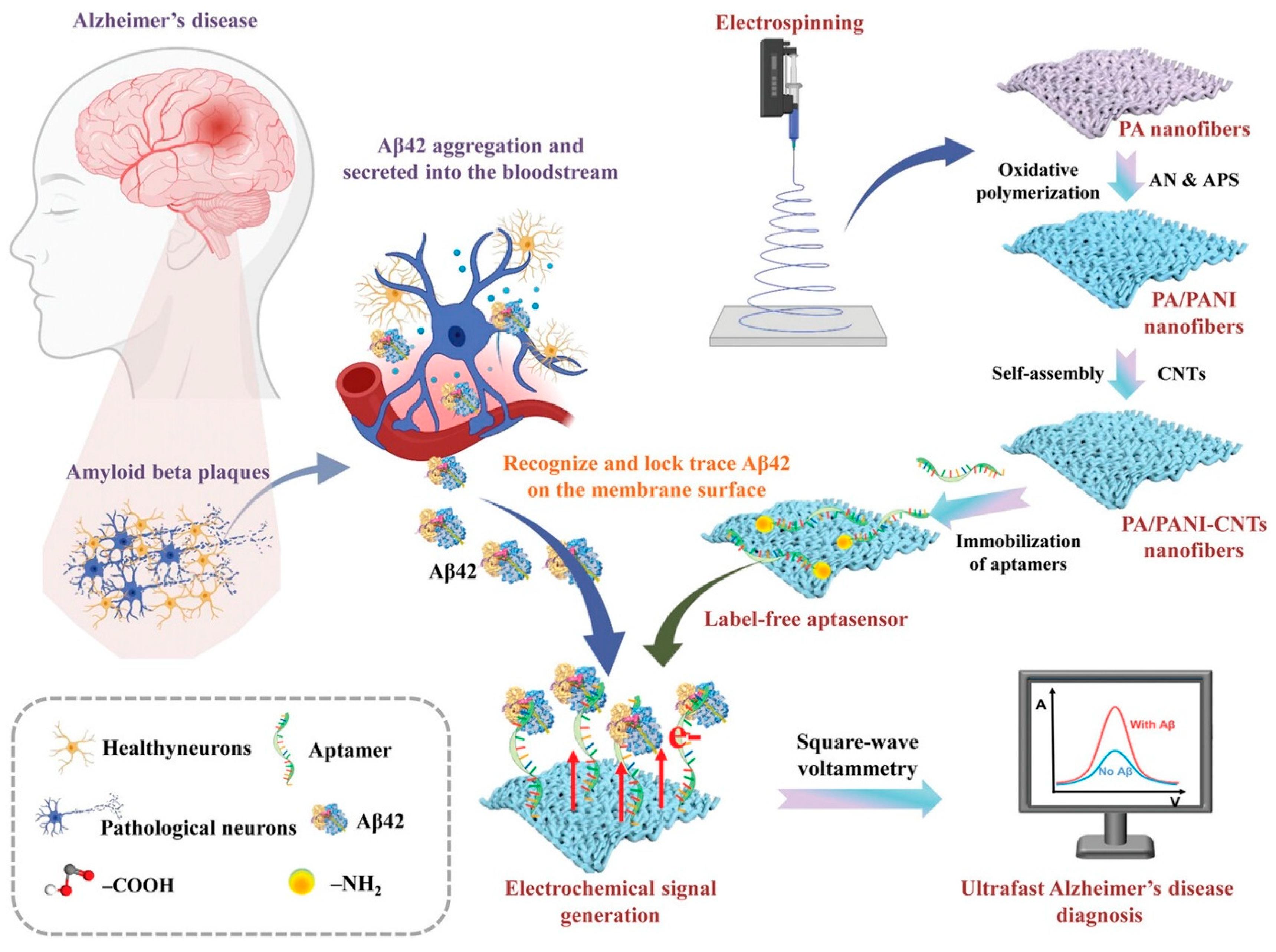- Liu, H.; Yuan, X.; Liu, T.; Zhang, W.; Dong, H.; Chu, Z. Freestanding Nanofiber-Assembled Aptasensor for Precisely and Ultrafast Electrochemical Detection of Alzheimer’s Disease Biomarkers. Adv. Healthc. Mater. 2024, 13, e2304355. [Google Scholar] [CrossRef]