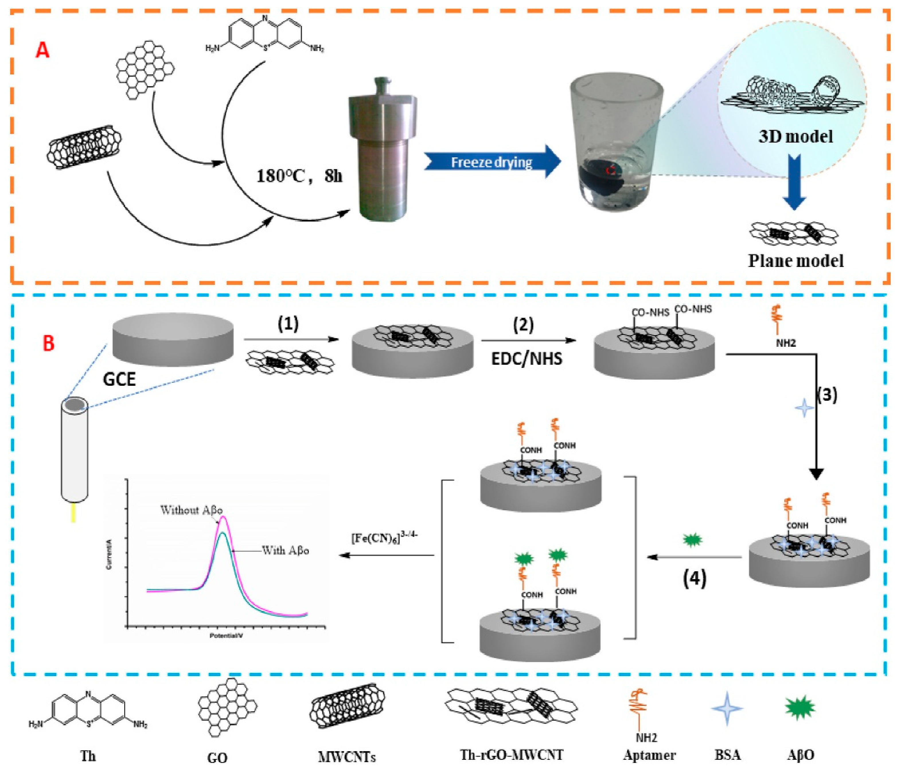 - Tao, D.; Xie, C.; Fu, S.; Rong, S.; Song, S.; Ye, H.; Jaffrezic-Renault, N.; Guo, Z. Thionine-functionalized three-dimensional carbon nanomaterial-based aptasensor for analysis of Abeta oligomers in serum. Anal. Chim. Acta 2021, 1183, 338990. [Google Scholar] [CrossRef]