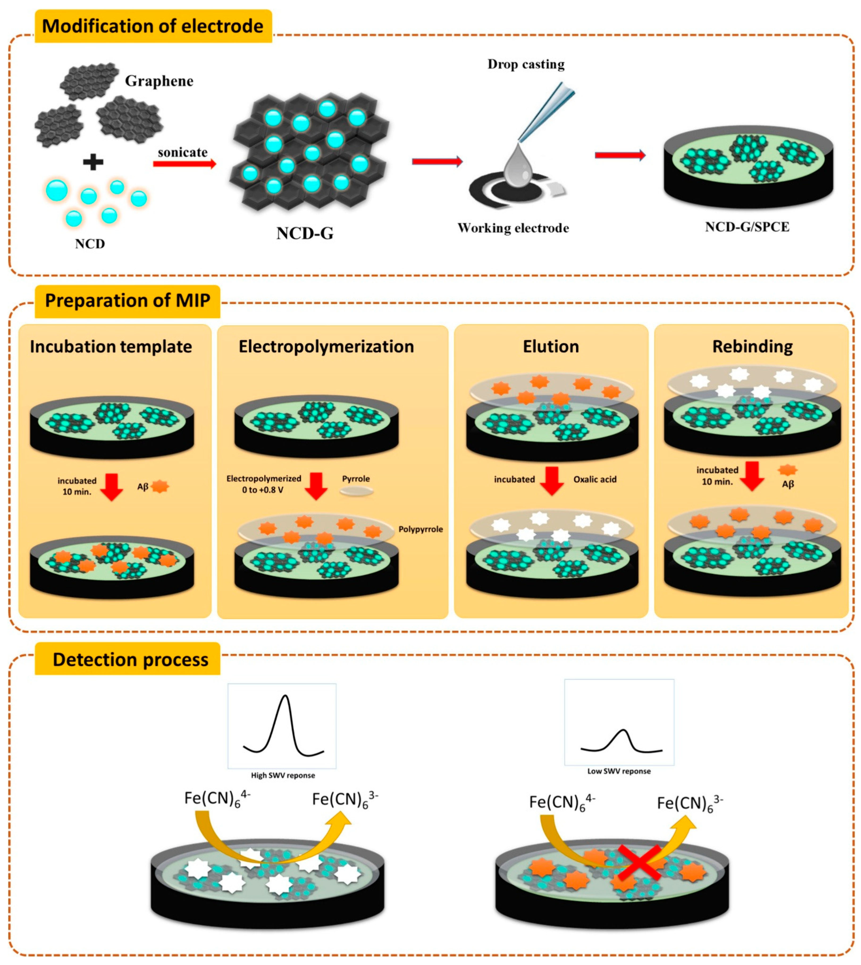 - Pakapongpan, S.; Poo-arporn, Y.; Ninket, S.; Poo-arporn, R.P. A disposable electrochemical sensor for amyloid-β42 protein based on molecular imprinted polymers with nitrogen doped carbon dots-graphene nanohybrid. Microchem. J. 2024, 206, 111559. [Google Scholar] [CrossRef]