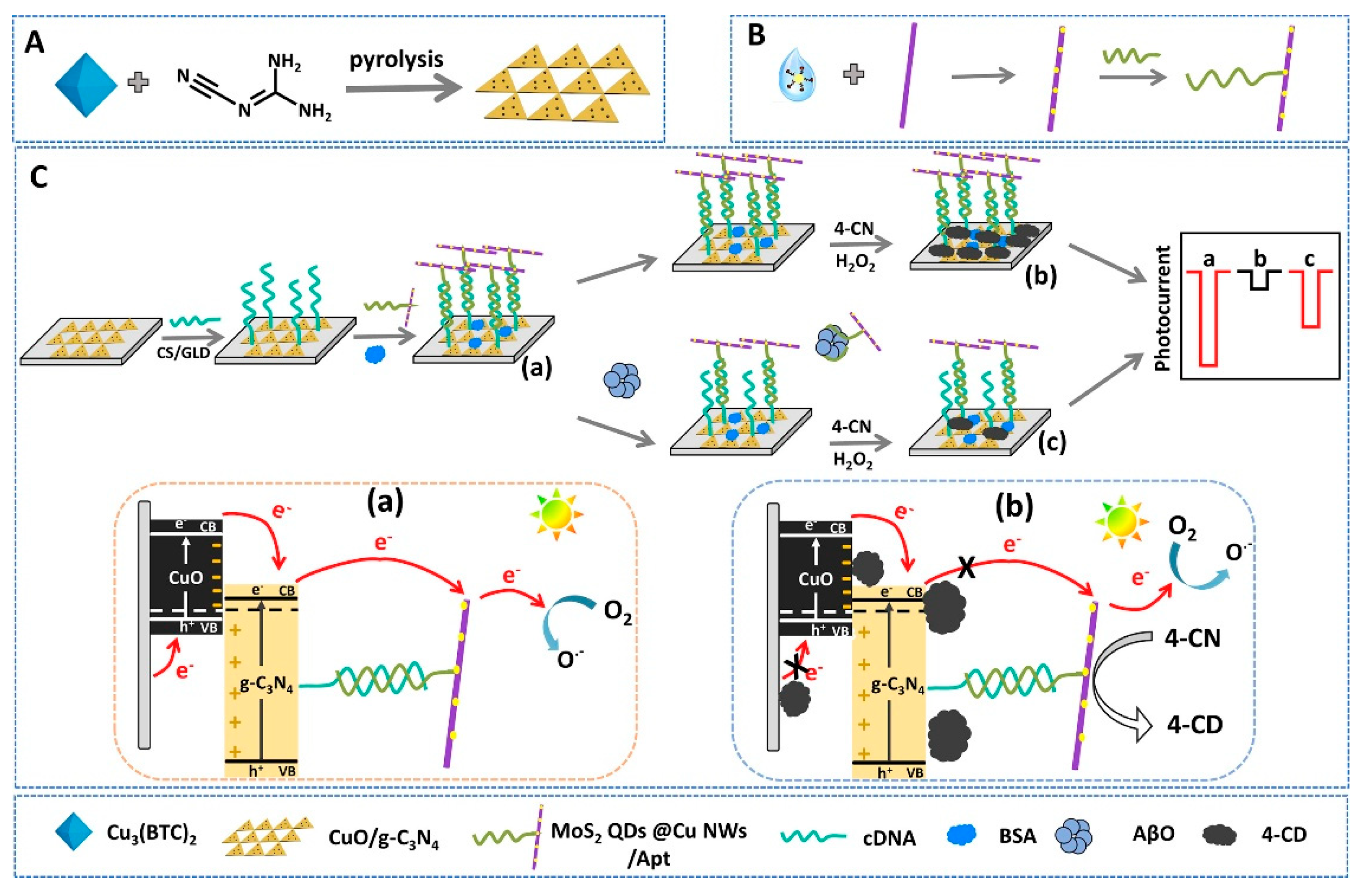 - Zhang, J.; Zhang, X.; Gao, Y.; Yan, J.; Song, W. Integrating CuO/g-C(3)N(4) p-n heterojunctioned photocathode with MoS(2) QDs@Cu NWs multifunctional signal amplifier for ultrasensitive detection of AbetaO. Biosens. Bioelectron. 2021, 176, 112945. [Google Scholar] [CrossRef]