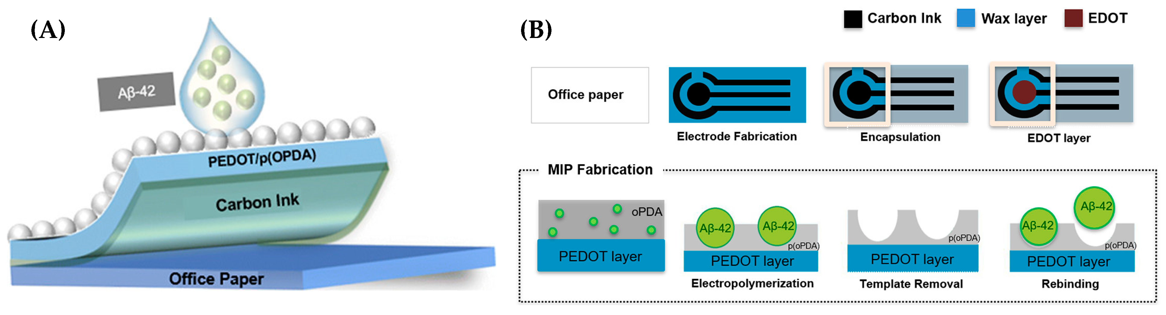 - Pereira, M.V.; Marques, A.C.; Oliveira, D.; Martins, R.; Moreira, F.T.C.; Sales, M.G.F.; Fortunato, E. Paper-Based Platform with an In Situ Molecularly Imprinted Polymer for beta-Amyloid. ACS Omega 2020, 5, 12057–12066. [Google Scholar] [CrossRef]