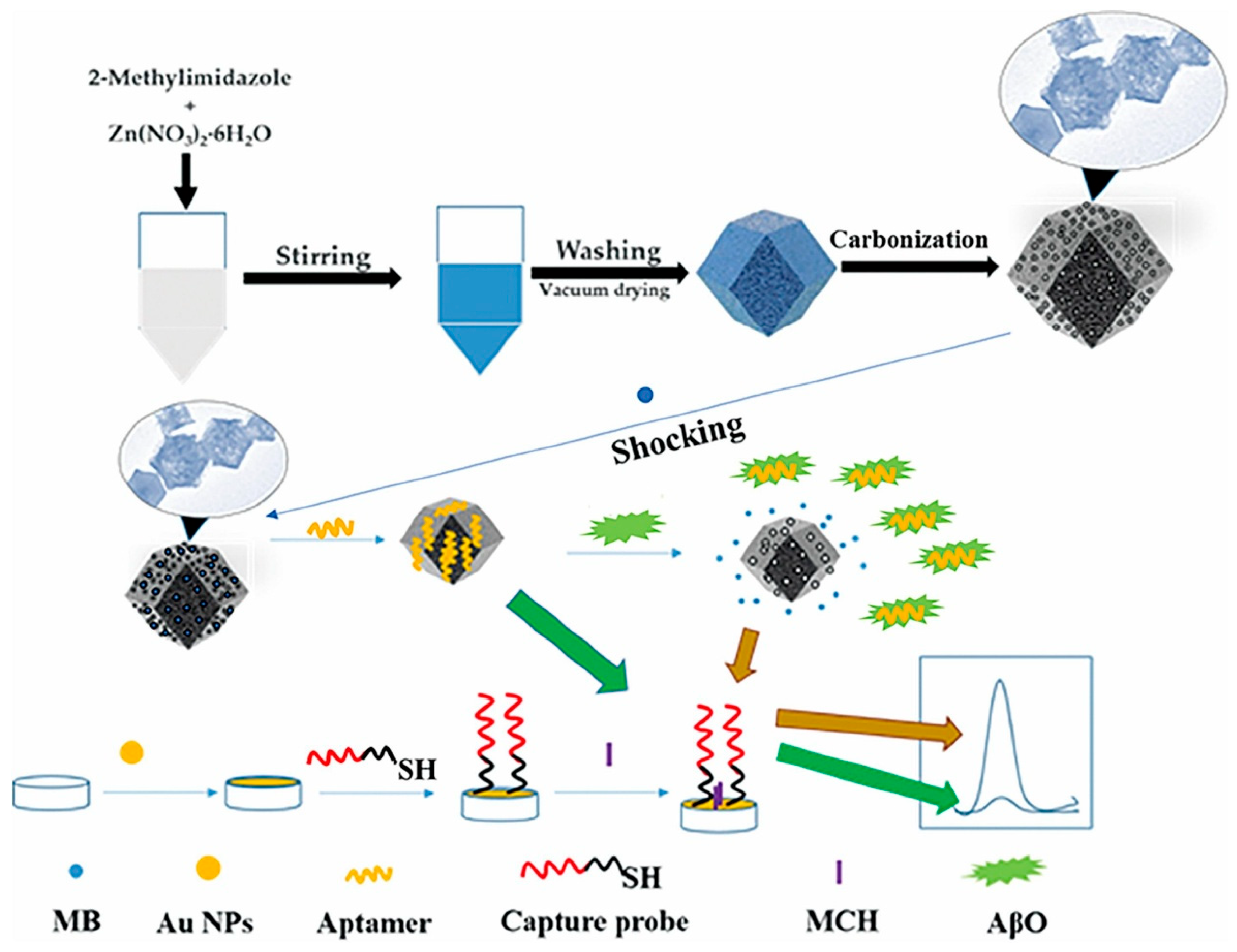 - Ren, Z.; Guo, W.; Umar, A.; Zhao, C.; Wang, L.; Ibrahim, A.A.; Alkhanjaf, A.A.M.; Baskoutas, S.; Pei, M.; Zhang, X. An electrochemical aptasensor based on stimulus response and signal amplification strategy for the detection of Amyloid-β oligomers. Microchem. J. 2023, 195, 109377. [Google Scholar] [CrossRef]