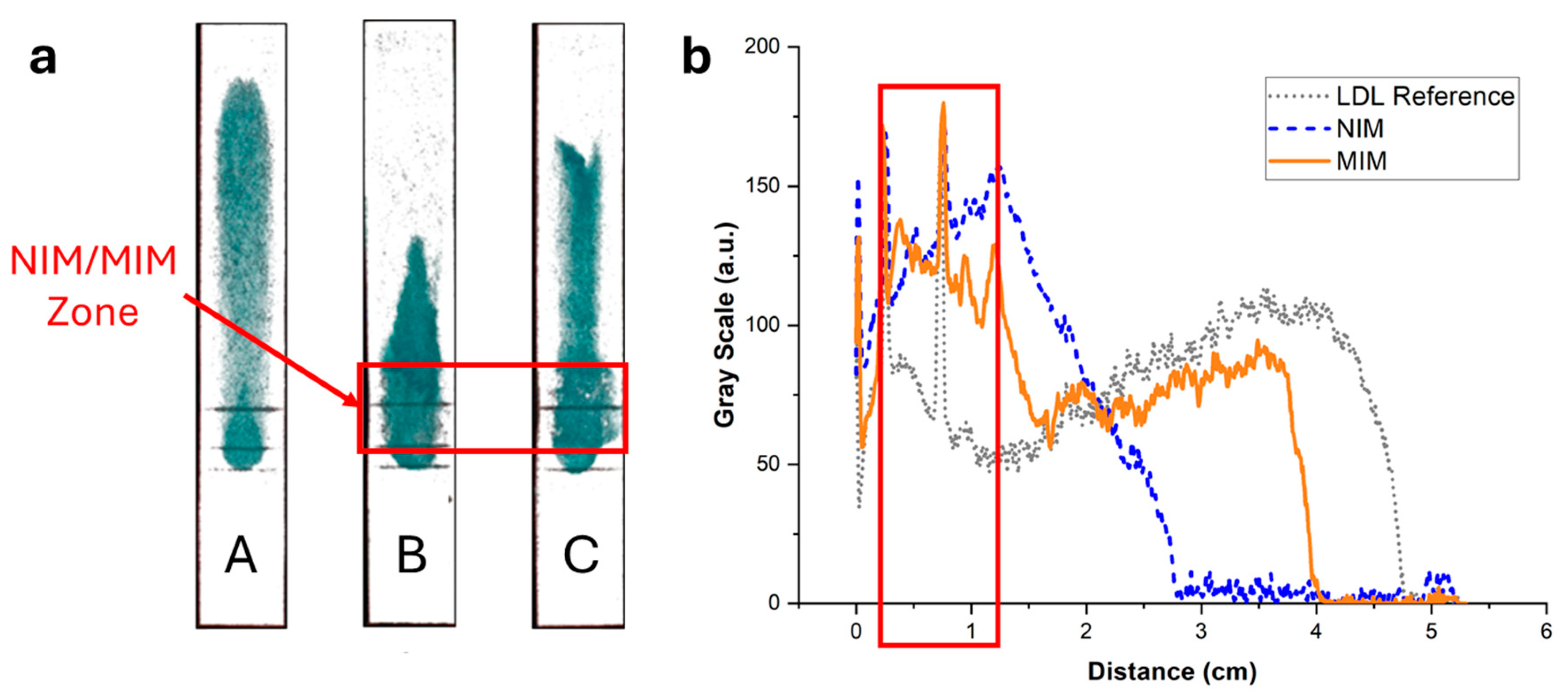 - An MIM zone—Located between 20 and 30 mm. The MIM zone contained ~0.28 mg of MIP NPAs deposited by dispensing drops of MIP NPA solution at the 25 mm mark. Assuming complete retention of the MIP NPAs during preparation (which remains unverified), this would correspond to an estimated density of ~47 mg/mL—approximately eight times higher than in the depletion experiment shown in Figure 3;