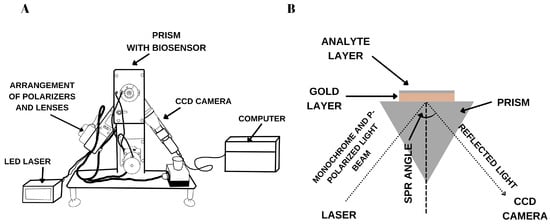 A diagram showing the construction of (A) the SPRi device with its components, (B) Kretschmann configuration.