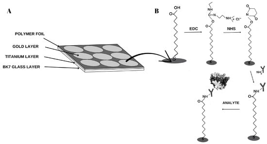 The measurement chips used are made of BK7 glass, but to facilitate gold adsorption (50 nm), a 1 nm titanium layer is placed between the gold and the glass. The structure of the measurement chip is shown in Figure 2A. To functionalize the surface, the chip is immersed in a 1 mM alcoholic solution of 11-mercaptoundecanoic acid for approximately 24 h. After this time, the chip is rinsed twice in ethyl alcohol and water and dried in an argon stream. The next step is to apply a propylene foil, which separates nine measurement sites on a single chip. This allows up to nine samples to be measured in a single measurement. The foil prevents mixing of the solutions. There is glue on the foil that allows it to be attached to the chip.
