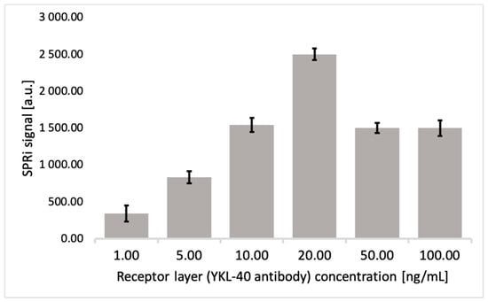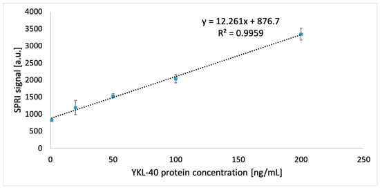 This paper presents an SPRi biosensor for YKL-40 determinations in biological materials. There are no previous reports describing a biosensor of this kind. The above-mentioned reports describe, for example, an electrochemical immunosensor that, despite its high sensitivity, is unsuitable for real-time imaging and multiplexing [23]. The same applies to the photothermal platform [24], which requires labeling. In turn, the BIAcore 2000 does not support multi-site imaging or detailed spatial resolution [25]. The SPRi detection method used in this article offers significantly more possibilities. First, we do not need labeled receptor layers or complex components in this range to capture the analyte of interest from the sample. The method is based on a direct protein–antibody reaction.
